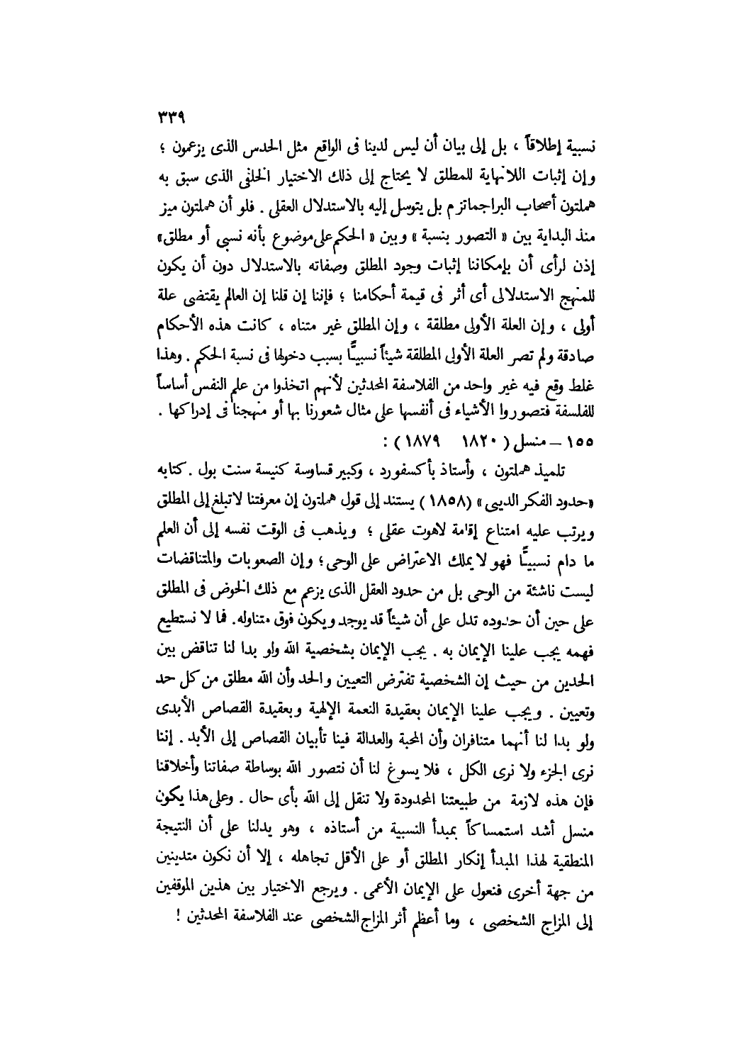 نسبية إطلاقًا، بل إلى بيان أن ليس لدينا في الواقع مثل الحدس الذي يزعمون, وإن إثبات اللانهاية للمطلق لا يحتاج إلى ذلك الاختيار الخلقي الذي سبق به هملتون أصحاب البراجماتزم, بل يتوسل إليه بالاستدلال العقلي. فلو أن هملتون ميز منذ البداية بين "التصور بنسبة" وبين "الحكم على موضوع بأنه نسبي أو مطلق" إذن لرأى أن بإمكاننا إثبات وجود المطلق وصفاته بالاستدلال دون أن يكون للمنهج الاستدلالي أي أثر في قيمة أحكامنا؛ فإننا إن قلنا: إن العالم يقتضي علة أولى، وإن العلة الأولى مطلقة، وإن المطلق غير متناه، كانت هذه الأحكام صادقة ولم تصر العلة الأولى المطلقة شيئًا نسبيًّا بسبب دخولها في نسبة الحكم. وهذا غلط وقع فيه غير واحد من الفلاسفة المحدثين لأنهم اتخذوا من علم النفس أساسًا للفلسفة, فتصوروا الأشياء في أنفسها على مثال شعورنا بها أو منهجنا في إدراكها.