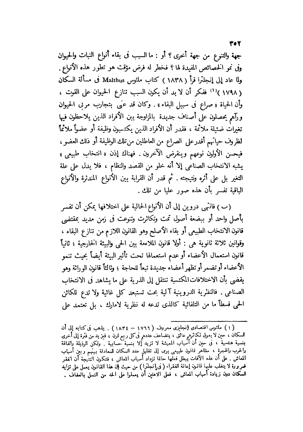جهة والتنوع من جهة أخرى؟ أو ما السبب في بقاء أنواع النبات والحيوان وفي نمو الخصائص المفيدة لها؟ فخطر له فرض مؤقت هو تطور هذه الأنواع. ولما عاد إلى إنجلترا قرأ " 1838 " كتاب ملثوس Malthus في مسألة السكان " 1798 " 1 ففكر أن لا بد أن يكون السبب تنازع الحيوان على القوت، وأن الحياة "صراع في سبيل البقاء". وكان قد عني بتجارب مربي الحيوان ورآهم يحصلون على أصناف جديدة بالمزاوجة بين الأفراد الذين يلاحظون فيها تغيرات ضئيلة ملائمة، فقدر أن الأفراد الذين يكتسبون وظيفة أو عضوًا ملائمًا لظروف حياتهم أقدر على الصراع من العاطلين من تلك الوظيفة أو ذلك العضو، فيحسن الأولون نوعهم وينقرض الآخرون. فهناك إذن "انتخاب طبيعي" يشبه الانتخاب الصناعي إلا أنه خلو من القصد والنظام، فلا يدل على علة التغير بل على أثره ونتيجته. ثم قدر أن القرابة بين الأنواع المندثرة والأنواع الباقية تفسر بأن هذه صور عليا من تلك.