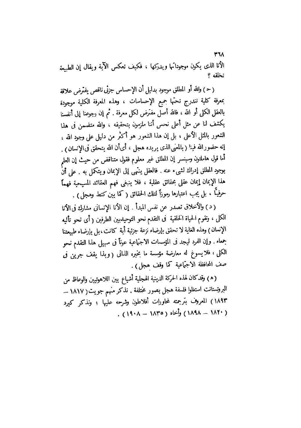 ج- والله أو المطلق موجود بدليل أن الإحساس جزئي ناقص يفترض علاقة بمعرفة كلية تندرج تحتها جميع الإحساسات، وهذه المعرفة الكلية موجودة بالعقل الكلي أو الله، فالله أصل مفترض لكل معرفة. ثم إن رجوعنا إلى أنفسنا يكشف لنا عن مثل أعلى نحس أننا ملزمون بتحقيقه، والله متضمن في هذا الشعور بالمثل الأعلى، بل إن هذا الشعور هو أكثر من دليل على وجود الله، إنه حضور الله فينا "بالمعنى الذي يريده هجل، أي: إن الله يتحقق في الإنسان". أما قول هاملتون وسبنسر: إن المطلق غير معلوم فقول متناقض من حيث إن العلم بوجود المطلق إدراك لشيء عنه. فالعقل ينتهي إلى الإيمان ويتكمل به, على أن هذا الإيمان إيمان عقلي بحقائق عقلية، فلا ينبغي فهم العقائد المسيحية فهمًا حرفيًّا، بل يجب اعتبارها رموزًا لتلك الحقائق "كما بين كنط وهجل".