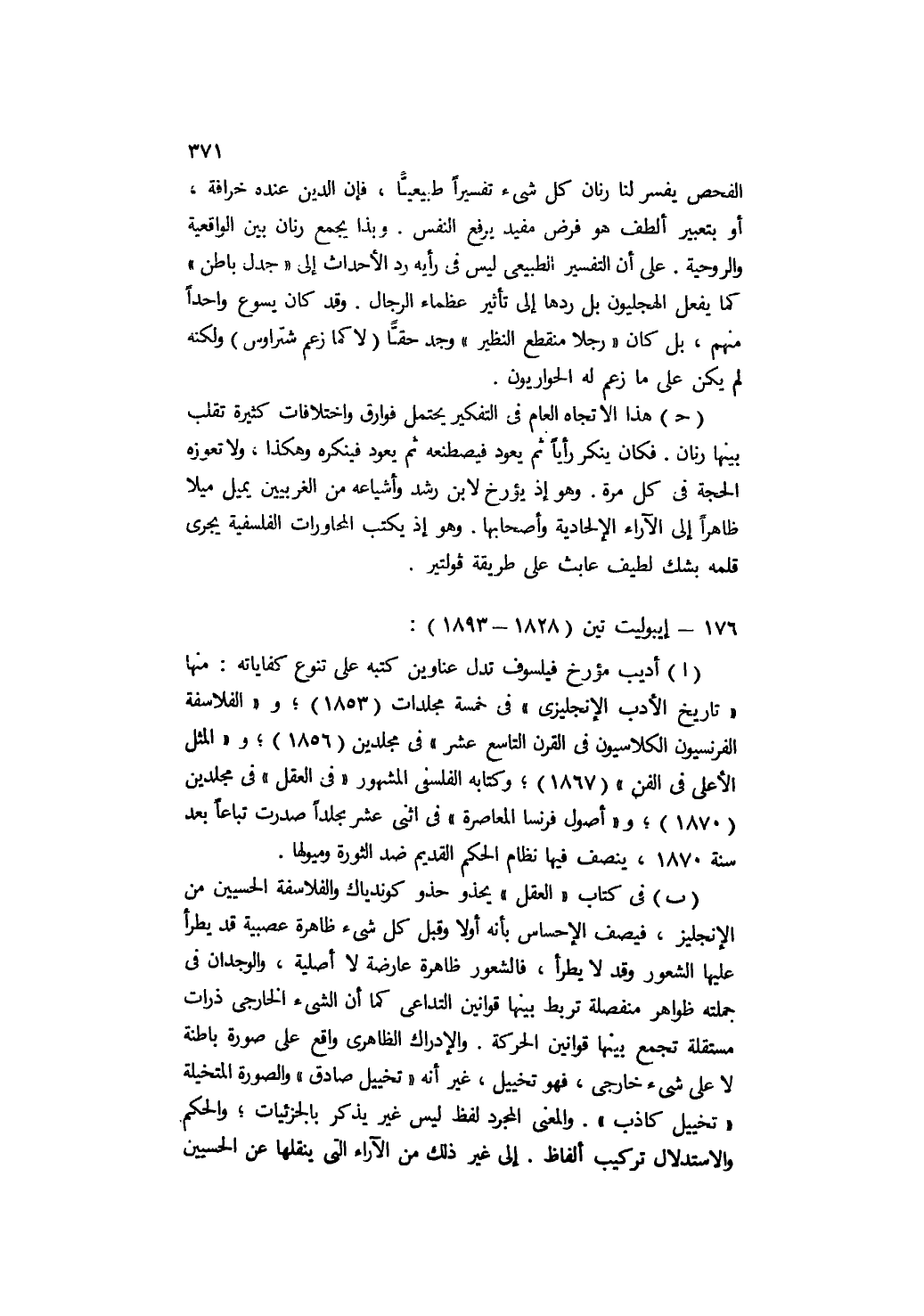 ج- هذا الاتجاه العام في التفكير يحتمل فوارق واختلافات كثيرة تقلب بينها رنان. فكان ينكر رأيًا ثم يعود فيصطنعه ثم يعود فينكره وهكذا، ولا تعوزه الحجة في كل مرة. وهو إذ يؤرخ لابن رشد وأشياعه من الغربيين يميل ميلًا ظاهرًا إلى الآراء الإلحادية وأصحابها. وهو إذ يكتب المحاورات الفلسفية يجري قلمه بشك لطيف عابث على طريقة فولتير.