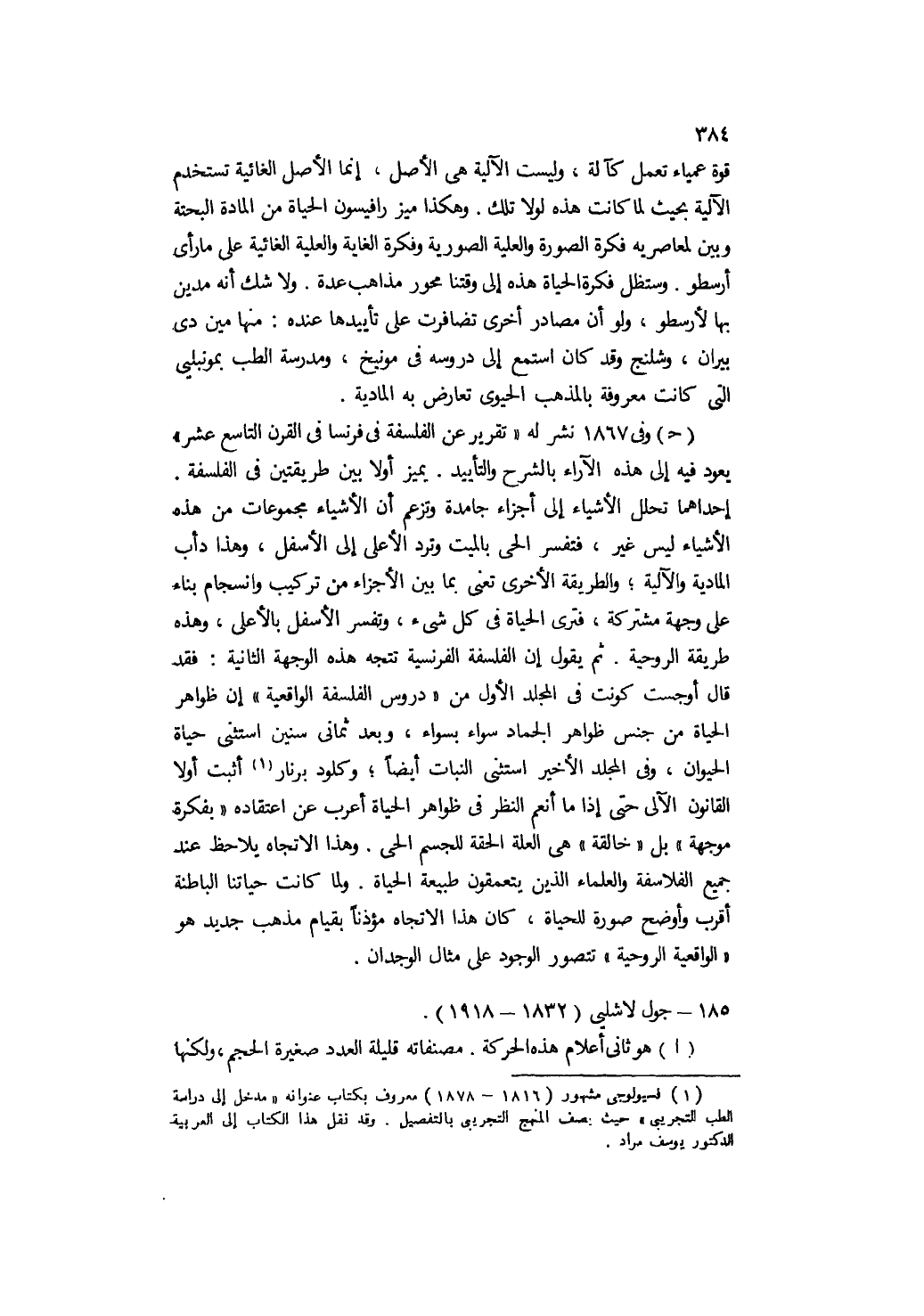 ج- وفي 1867 نشر له "تقرير عن الفلسفة في فرنسا في القرن التاسع عشر" يعود فيه إلى هذه الآراء بالشرح والتأييد. يميز أولًا بين طريقتين في الفلسفة, إحداهما تحلل الأشياء إلى أجزاء جامدة وتزعم أن الأشياء مجموعات من هذه الأشياء ليس غير، فتفسر الحي بالميت وترد الأعلى إلى الأسفل، وهذا دأب المادية والآلية؛ والطريقة الأخرى تعنى بما بين الأجزاء من تركيب وانسجام بناء على وجهة مشتركة، فترى الحياة في كل شيء، وتفسر الأسفل بالأعلى، وهذه طريقة الروحية. ثم يقول: إن الفلسفة الفرنسية تتجه هذه الوجهة الثانية, فقد قال أوجست كونت في المجلد الأول من "دروس الفلسفة الواقعية": إن ظواهر الحياة من جنس ظواهر الجماد سواء بسواء، وبعد ثماني سنين استثنى حياة الحيوان، وفي المجلد الأخير استثنى النبات أيضًا؛ وكلود برنار 1 أثبت أولًا القانون الآلي حتى إذا ما أنعم النظر في ظواهر الحياة أعرب عن اعتقاده "بفكرة موجهة" بل "خالقة" هي العلة الحقة للجسم الحي. وهذا الاتجاه يلاحظ عند جميع الفلاسفة والعلماء الذين يتعمقون طبيعة الحياة. ولما كانت حياتنا الباطنة أقرب وأوضح صورة للحياة، كان هذا الاتجاه مؤذنًا بقيام مذهب جديد هو "الواقعية الروحية" تتصور الوجود على مثال الوجدان.
