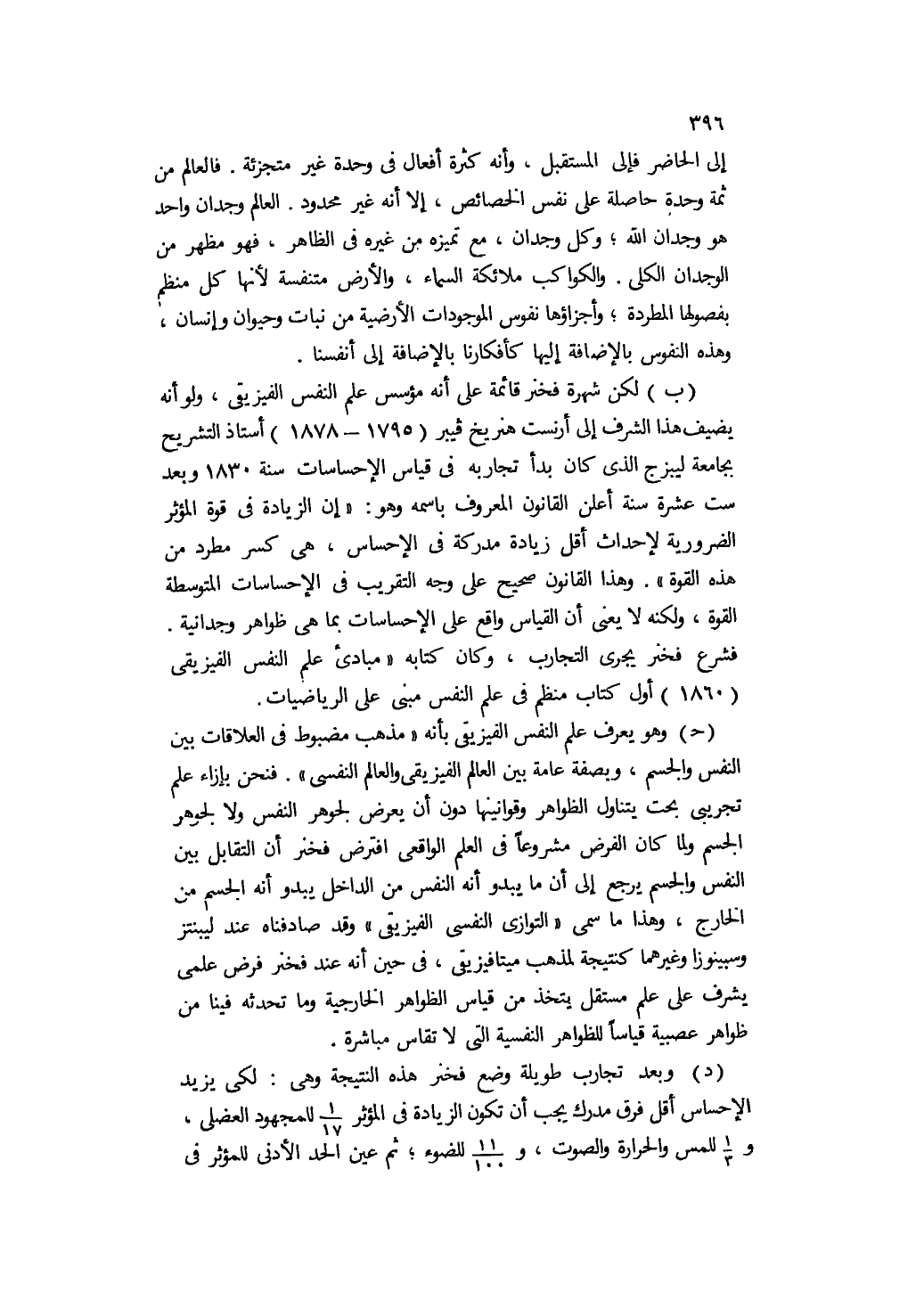 ب- لكن شهرة فخنر قائمة على أنه مؤسس علم النفس الفيزيقي، ولو أنه يضيف هذا الشرف إلى أرنست هنريخ فيبر " 1795 - 1878 " أستاذ التشريح بجامعة ليبزج الذي كان بدأ تجاربه في قياس الإحساسات سنة 1830 وبعد ست عشرة سنة أعلن القانون المعروف باسمه, وهو: "إن الزيادة في قوة المؤثر الضرورية لإحداث أقل زيادة مدركة في الإحساس، هي كسر مطرد من هذه القوة". وهذا القانون صحيح على وجه التقريب في الإحساسات المتوسطة القوة، ولكنه لا يعني أن القياس واقع على الإحساسات بما هي ظواهر وجدانية. فشرع فخنر يجري التجارب, وكان كتابه "مبادئ علم النفس الفيزيقي" " 1860 " أول كتاب منظم في علم النفس مبني على الرياضيات.