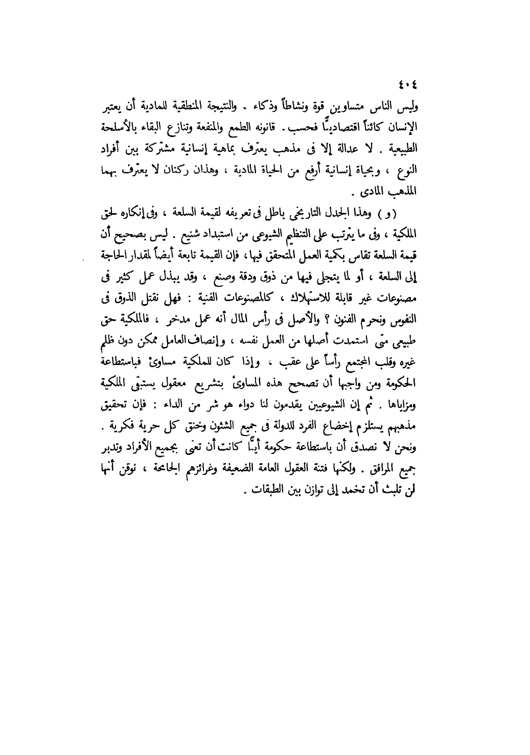 ووهذا الجدل التاريخي باطل في تعريفه لقيمة السلعة، وفي إنكاره لحق الملكية، وفيما يترتب على التنظيم الشيوعي من استبداد شنيع. ليس بصحيح أن قيمة السلعة تقاس بكمية العمل المتحقق فيها، فإن القيمة تابعة أيضًا لمقدار الحاجة إلى السلعة، أو لما يتجلى فيها من ذوق ودقة وصنع، وقد يبذل عمل كثير في مصنوعات غير قابلة للاستهلاك، كالمصنوعات الفنية, فهل نقتل الذوق في النفوس ونحرم الفنون؟ والأصل في رأس المال أنه عمل مدخر، فالملكية حق طبيعي متى استمدت أصلها من العمل نفسه، وإنصاف العامل ممكن دون ظلم غيره وقلب المجتمع رأسًا على عقب, وإذا كان للملكية مساوئ فباستطاعة الحكومة ومن واجبها أن تصحح هذه المساوئ بتشريع معقول يستبقي الملكية ومزاياها. ثم إن الشيوعيين يقدمون لنا دواء هو شر من الداء؛ فإن تحقيق مذهبهم يستلزم إخضاع الفرد للدولة في جميع الشئون وخنق كل حرية فكرية. ونحن لا نصدق أن باستطاعة حكومة أيا كانت أن تعنى بجميع الأفراد وتدبر جميع المرافق, ولكنها فتنة العقول العامة الضعيفة وغرائزهم الجامحة، نوقن أنها لن تلبث أن تخمد إلى توازن بين الطبقات.