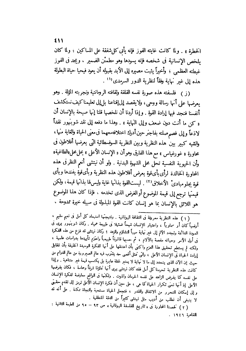 1 هذه النظرية معروفة في الثقافة اليونانية, ونتيجتها استبعاد كل أمل في نعيم مقيم، أرضيا كان أو سماويا، واعتبار الإنسان شبحا ضيئلا في طبيعة عمياء. وكان شوبنهور يرى في العودة الدائمة وتجدد الألم إلى غير نهاية سببًا للتشاؤم والزهد؛ وكان نيتشي قد فزع من هذه الفكرة في أول الأمر وحياته مفعمة بالآلام، ثم حسبها قانونا طبيعيا واعتزم تأييدها بدراسات علمية، ولكنه لم يستطع تحقيق هذا العزم واكتفى بأن اعتنقها على أنها الفكرة الوحيدة الخليقة بأن تقابل إرادة الحياة في الإنسان الأعلى، والتي تمثل أقصى حد يقترب فيه عالم الصيرورة من عالم الدوام من حيث إن الآن الذي يتحدد إلى ما لا نهاية لا يعتبر لحظة عابرة بل يكتسب قيمة غير متناهية. وإذا كانت هذه النظرية تحرمنا كل أمل فقد كان نيتشي يرى أنها تملؤنا شرفًا وحماسة، فكان يفرضها على نفسه كما يفرض الزاهد على نفسه الحرمان والموت، ولكنها في الواقع معارضة لفكرة الإنسان الأعلى إذ إنها تعني تكرار الحياة كما هي، على حين أن فكرة الإنسان الأعلى ترمز إلى تقدم حقيقي, وإلى إمكان التحرر من الاتفاق والقدر، فتجعل الحياة مستحبة والنجاة ممكنة، على أنه قد لا ينبغي أن نطلب من أديب مثل نيتشي كثيرًا من الدقة المنطقية.