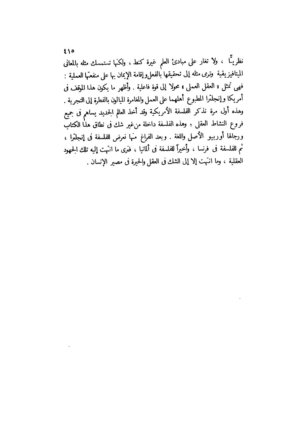 نظريًّا، ولا تغار على مبادئ العلم غيرة كنط، ولكنها تستمسك مثله بالمعاني الميتافيزيقية وترمي مثله إلى تحقيقها بالفعل وإقامة الإيمان بها على منفعتها العملية. فهي تمثل "العقل العملي" محولًا إلى قوة فاعلية. وأظهر ما يكون هذا الموقف في أمريكا وإنجلترا, المطبوع أهلهما على العمل والمغامرة الميالون بالفطرة إلى التجربة. وهذه أول مرة نذكر الفلسفة الأمريكية وقد أخذ العالم الجديد يساهم في جميع فروع النشاط العقلي؛ وهذه الفلسفة داخلة من غير شك في نطاق هذا الكتاب ورجالها أوروبيو الأصل واللغة. وبعد الفراغ منها نعرض للفلسفة في إنجلترا, ثم للفلسفة في فرنسا، وأخيرا للفلسفة في ألمانيا، فنرى ما انتهت إليه تلك الجهود العقلية، وما انتهت إلا إلى الشك في العقل والحيرة في مصير الإنسان.