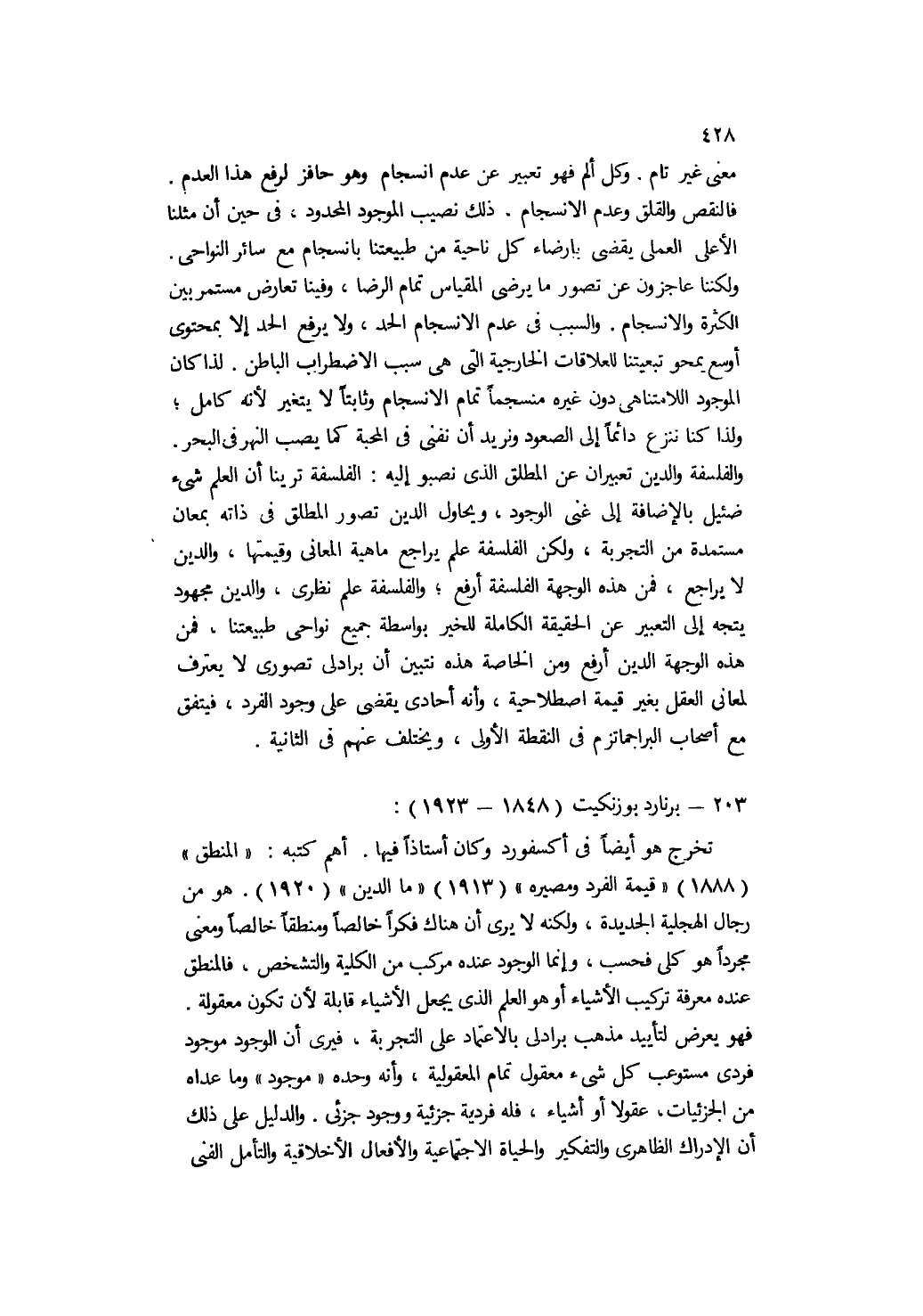 معنى غير تام. وكل ألم فهو تعبير عن عدم انسجام وهو حافز لرفع هذا العدم. فالنقص والقلق وعدم الانسجام, ذلك نصيب الموجود المحدود، في حين أن مثلنا الأعلى العملي يقضي بإرضاء كل ناحية من طبيعتنا بانسجام مع سائر النواحي. ولكننا عاجزون عن تصور ما يرضي المقياس تمام الرضا, وفينا تعارض مستمر بين الكثرة والانسجام. والسبب في عدم الانسجام الحد، ولا يرفع الحد إلا بمحتوى أوسع يمحو تبعيتنا للعلاقات الخارجية التي هي سبب الاضطراب الباطن. لذا كان الموجود اللامتناهي دون غيره منسجمًا تمام الانسجام وثابتًا لا يتغير لأنه كامل؛ ولذا كنا ننزع دائمًا إلى الصعود ونريد أن نفنى في المحبة كما يصب النهر في البحر, والفلسفة والدين تعبيران عن المطلق الذي نصبو إليه. الفلسفة ترينا أن العلم شيء ضئيل بالإضافة إلى غنى الوجود، ويحاول الدين تصور المطلق في ذاته بمعانٍ مستمدة من التجربة، ولكن الفلسفة علم يراجع ماهية المعاني وقيمتها, والدين لا يراجع، فمن هذه الوجهة الفلسفة أرفع؛ والفلسفة علم نظري، والدين مجهود يتجه إلى التعبير عن الحقيقة الكاملة للخير بواسطة جميع نواحي طبيعتنا، فمن هذه الوجهة الدين أرفع ومن الخاصة هذه نتبين أن برادلي تصوري لا يعترف لمعاني العقل بغير قيمة اصطلاحية، وأنه أحادي يقضي على وجود الفرد، فيتفق مع أصحاب البراجماتزم في النقطة الأولى، ويختلف عنهم في الثانية.
