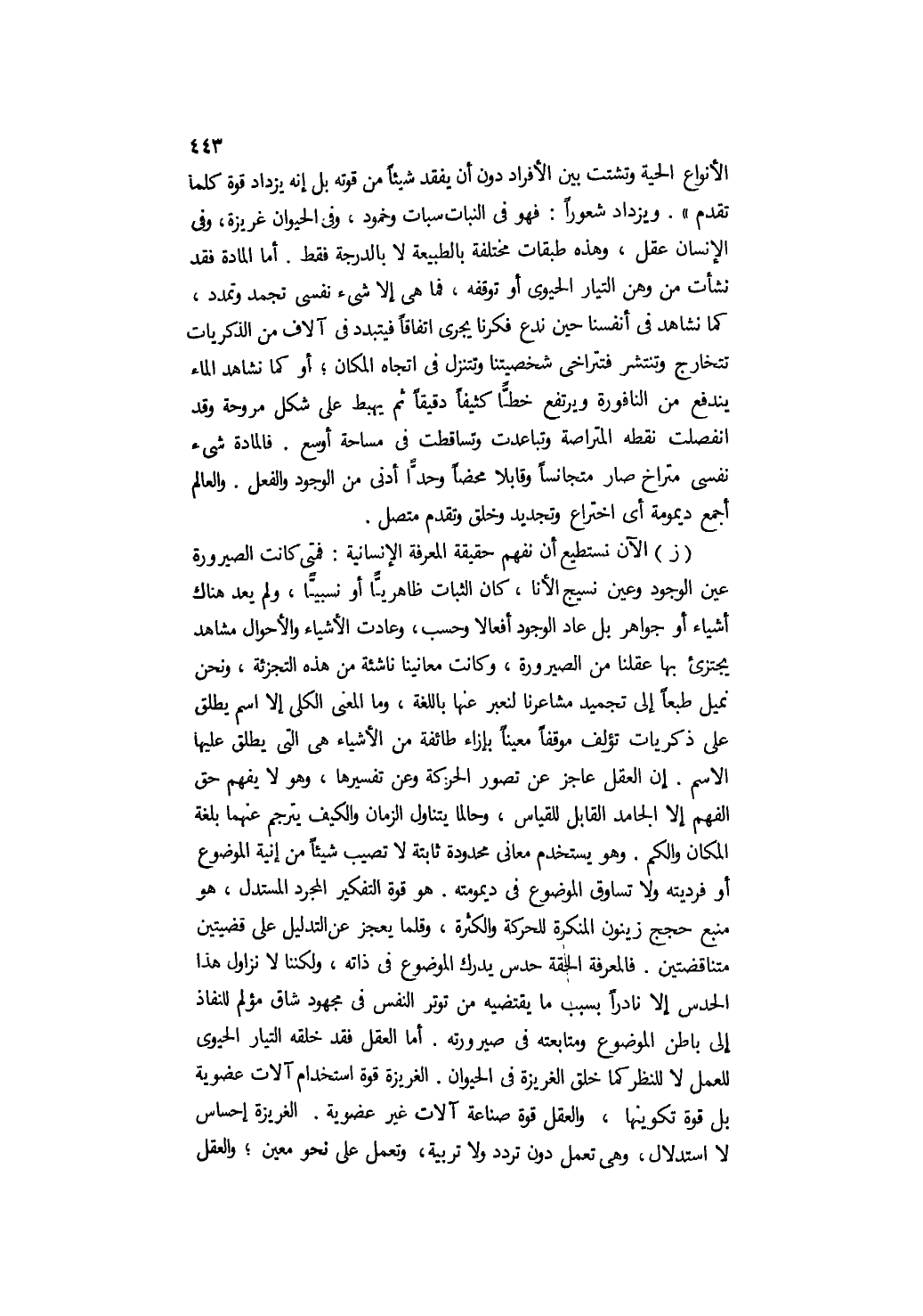 ز- الآن نستطيع أن نفهم حقيقة المعرفة الإنسانية, فمتى كانت الصيرورة عين الوجود وعين نسيج الأنا، كان الثبات ظاهريا أو نسبيا، ولم يعد هناك أشياء أو جواهر بل عاد الوجود أفعالا وحسب, وعادت الأشياء والأحوال مشاهد يجتزئ بها عقلنا من الصيرورة، وكانت معانينا ناشئة من هذه التجزئة، ونحن نميل طبعا إلى تجميد مشاعرنا لنعبر عنها باللغة، وما المعنى الكلي إلا اسم يطلق على ذكريات تؤلف موقفًا معينًا بإزاء طائفة من الأشياء هي التي يطلق عليها الاسم. إن العقل عاجز عن تصور الحركة وعن تفسيرها, وهو لا يفهم حق الفهم إلا الجامد القابل للقياس, وحالما يتناول الزمان والكيف يترجم عنهما بلغة المكان والكم. وهو يستخدم معاني محدودة ثابتة لا تصيب شيئًا من إنية الموضوع أو فرديته ولا تساوق الموضوع في ديمومته. هو قوة التفكير المجرد المستدل، هو منبع حجج زينون المنكرة للحركة والكثرة، وقلما يعجز عن التدليل على قضيتين متناقضتين. فالمعرفة الحقة حدس يدرك الموضوع في ذاته، ولكننا لا نزاول هذا الحدس إلا نادرًا بسبب ما يقتضيه من توتر النفس في مجهود شاقّ مؤلم للنفاذ إلى باطن الموضوع ومتابعته في صيرورته. أما العقل فقد خلقه التيار الحيوي للعمل لا للنظر كما خلق الغريزة في الحيوان. الغريزة قوة استخدام آلات عضوية بل قوة تكوينها, والعقل قوة صناعة آلات غير عضوية. الغريزة إحساس لا استدلال، وهي تعمل دون تردد ولا تربية، وتعمل على نحو معين؛ والعقل