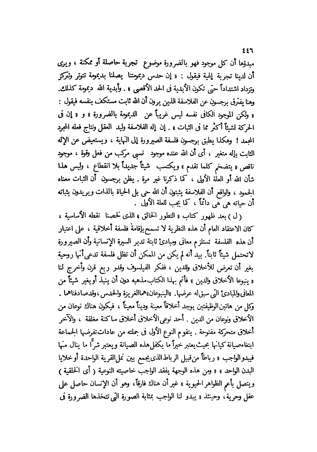 ل- بعد ظهور كتاب "التطور الخالق" الذي لخصنا نقطه الأساسية، كان الاعتقاد العام أن هذه النظرية لا تسمح بإقامة فلسفة أخلاقية، على اعتبار أن هذه الفلسفة تستلزم معاني ومبادئ ثابتة تدبر السيرة الإنسانية, وأن الصيرورة لا تحتمل شيئًا ثابتًا. بيد أنه لم يكن من الممكن أن تظل فلسفة تدعي أنها روحية بغير أن تعرض للأخلاق وللدين، ففكر الفيلسوف وقدر ربع قرن وأخرج لنا "ينبوعا الأخلاق والدين" فأتم بهذا الكتاب مذهبه دون أن ينبذ, أو يغير شيئًا من المعاني والمبادئ التي سبق له عرضها. "الينبوعان" هما الغريزة والحدس، وقد صادفناهما. وكل من هاتين الوظيفتين يوجد أخلاقًا معينة ودينا معينا، فيكون هناك نوعان من الأخلاق ونوعان من الدين. أحد نوعي الأخلاق أخلاق ساكنة مغلقة، والآخر أخلاق متحركة مفتوحة. يتقوم النوع الأول في جملته من عادات تفرضها الجماعة ابتغاء صيانة كيانها, بحيث يعتبر خيرًا ما يكفل هذه الصيانة, ويعتبر شرًّا ما ينال منها فيبدو الواجب "رباطا من قبيل الرباط الذي يجمع بين نمل القرية الواحدة أو خلايا البدن الواحد" "ومن هذه الوجهة يفقد الواجب خاصيته النوعية "أي: الخلقية" ويتصل بأعم الظواهر الحيوية" غير أن هناك فارقًا، وهو أن الإنسان حاصل على عقل وحرية، وحينئذ "يبدو لنا الواجب بمثابة الصورة التي تتخذها الضرورة في