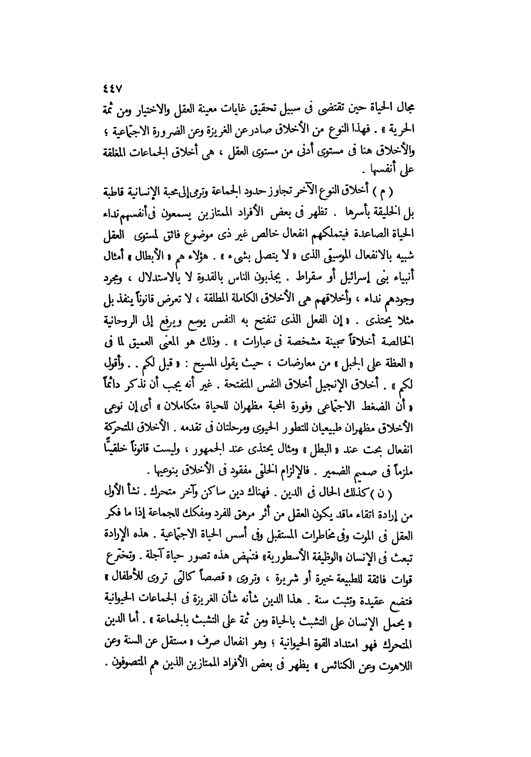 مجال الحياة حين تقتضي في سبيل تحقيق غايات معينة العقل والاختيار ومن ثمة الحرية". فهذا النوع من الأخلاق صادر عن الغريزة وعن الضرورة الاجتماعية؛ والأخلاق هنا في مستوى أدنى من مستوى العقل، هي أخلاق الجماعات المغلقة على أنفسها.