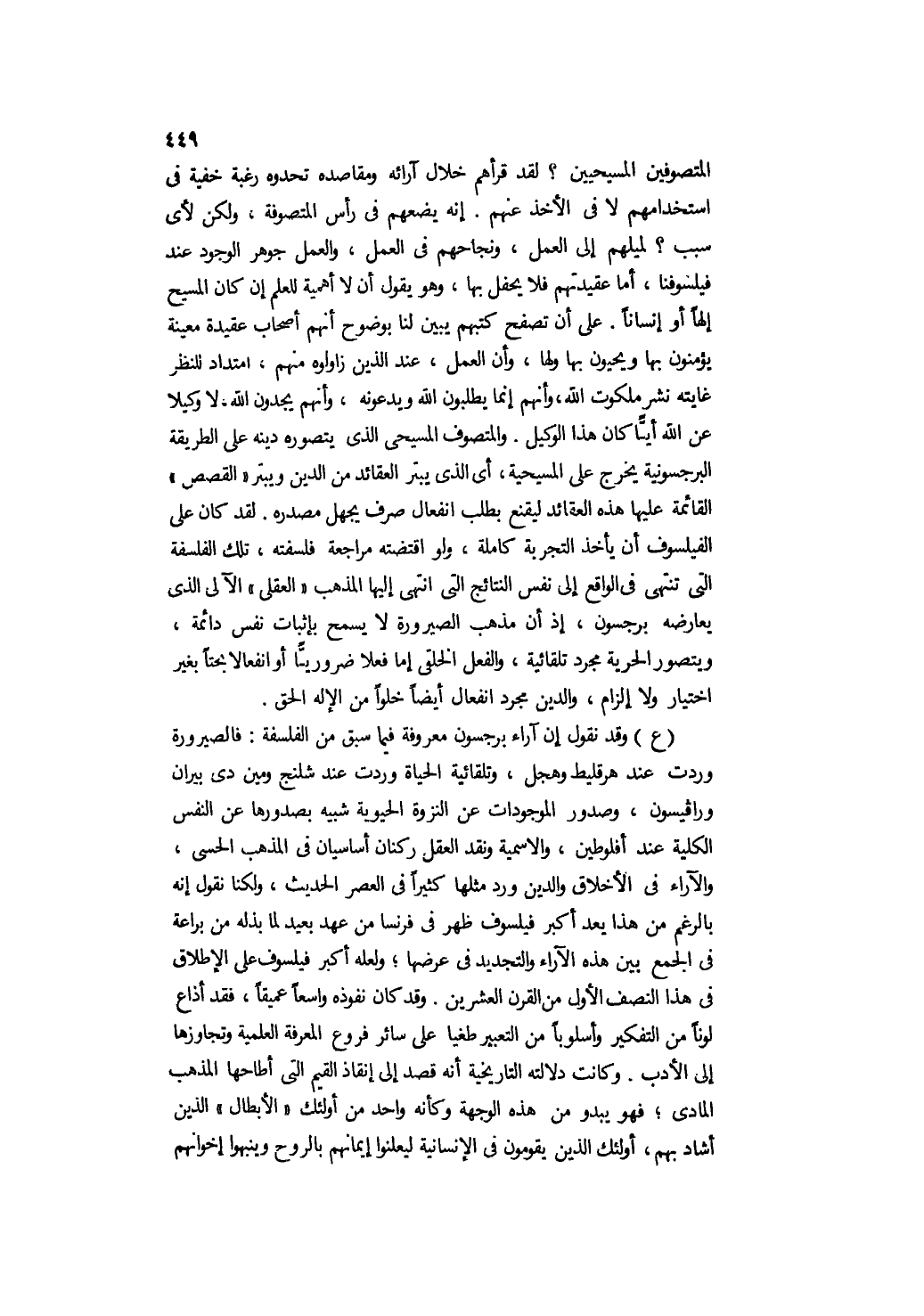 المتصوفين المسيحيين؟ لقد قرأهم خلال آرائه ومقاصده تحدوه رغبة خفية في استخدامهم لا في الأخذ عنهم. إنه يضعهم في رأس المتصوفة, ولكن لأي سبب؟ لميلهم إلى العمل، ونجاحهم في العمل، والعمل جوهر الوجود عند فيلسوفنا، أما عقيدتهم فلا يحفل بها، وهو يقول أن لا أهمية للعلم إن كان المسيح إلهًا وإنسانًا. على أن تصفح كتبهم يبين لنا بوضوح أنهم أصحاب عقيدة معينة يؤمنون بها ويحيون بها ولها، وأن العمل، عند الذين زاولوه منهم, امتداد للنظر غايته نشر ملكوت الله, وأنهم إنما يطلبون الله ويدعونه, وأنهم يجدون الله, لا وكيلا عن الله أيا كان هذا الوكيل. والمتصوف المسيحي الذي يتصوره دينه على الطريقة البرجسونية يخرج على المسيحية، أي: الذي يبتر العقائد من الدين ويبتر "القصص" القائمة عليها هذه العقائد ليقنع بطلب انفعال صرف يجهل مصدره. لقد كان على الفيلسوف أن يأخذ التجربة كاملة، ولو اقتضته مراجعة فلسفته، تلك الفلسفة التي تنتهي في الواقع إلى نفس النتائج التي انتهى إليها المذهب "العقلي" الآلي الذي يعارضه برجسون, إذ إن مذهب الصيرورة لا يسمح بإثبات نفس دائمة، ويتصور الحرية مجرد تلقائية، والفعل الخلقي إما فعلا ضروريا أو انفعالا بحتا بغير اختيار ولا إلزام، والدين مجرد انفعال أيضًا خلوا من الإله الحق.