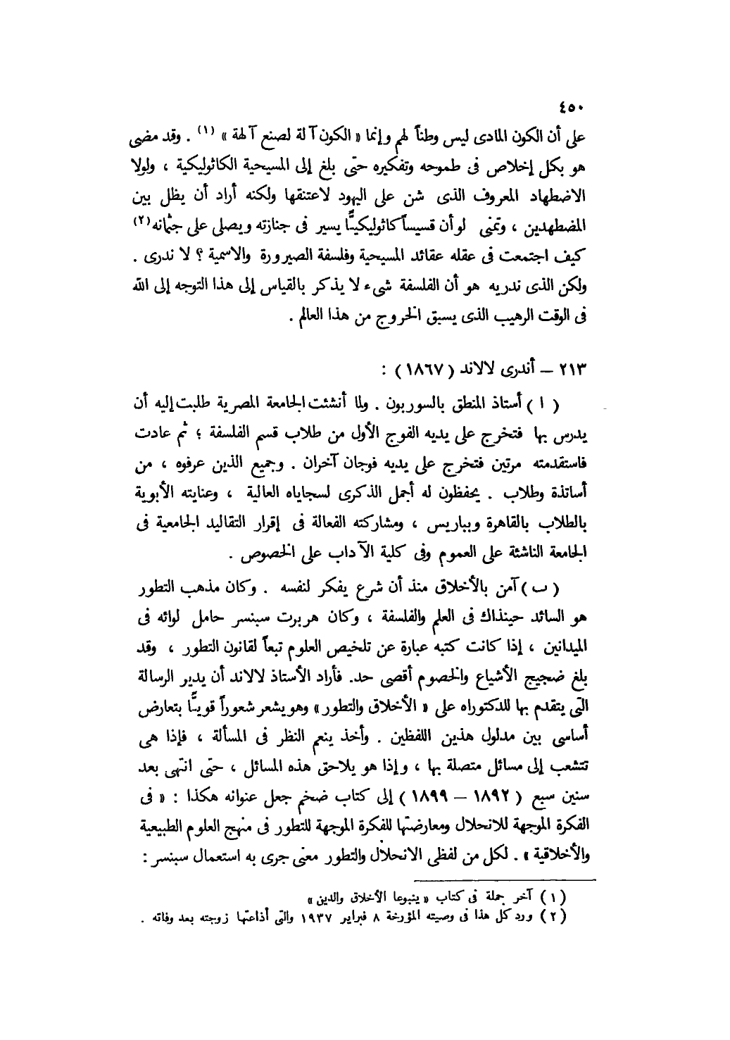 أ- أستاذ المنطق بالسوربون. ولما أنشئت الجامعة المصرية طلبت إليه أن يدرس بها فتخرج على يديه الفوج الأول من طلاب قسم الفلسفة، ثم عادت فاستقدمته مرتين فتخرج على يديه فوجان آخران. وجميع الذين عرفوه، من أساتذة وطلاب, يحفظون له أجمل الذكرى لسجاياه العالية، وعنايته الأبوية بالطلاب بالقاهرة وبباريس، ومشاركته الفعالة في إقرار التقاليد الجامعية في الجامعة الناشئة على العموم, وفي كلية الآداب على الخصوص.