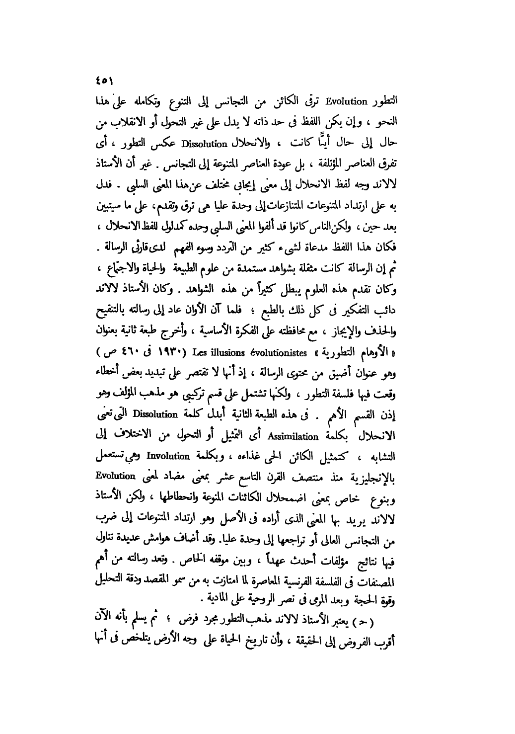 التطور Evolution ترقي الكائن من التجانس إلى التنوع وتكامله على هذا النحو، وإن يكن اللفظ في حد ذاته لا يدل على غير التحول أو الانقلاب من حال إلى حال أيا كانت, والانحلال Dissolution عكس التطور، أي: تفرق العناصر المؤتلفة، بل عودة العناصر المتنوعة إلى التجانس. غير أن الأستاذ لالاند وجه لفظ الانحلال إلى معنى إيجابي مختلف عن هذا المعنى السلبي. فدل به على ارتداد المتنوعات المتنازعات إلى وحدة عليا هي ترقّ وتقدم، على ما سيتبين بعد حين، ولكن الناس كانوا قد ألفوا المعنى السلبي وحده كمدلول للفظ الانحلال، فكان هذا اللفظ مدعاة لشيء كثير من التردد وسوء الفهم لدى قارئي الرسالة. ثم إن الرسالة كانت مثقلة بشواهد مستمدة من علوم الطبيعة والحياة والاجتماع، وكان تقدم هذه العلوم يبطل كثيرًا من هذه الشواهد. وكان الأستاذ لالاند دائب التفكير في كل ذلك بالطبع؛ فلما آن الأوان عاد إلى رسالته بالتنقيح والحذف والإيجاز، مع محافظته على الفكرة الأساسية، وأخرج طبعة ثانية بعنوان "الأوهام التطورية" Les illusions evolutionistes " 1930 في 460 صفحة" وهو عنوان أضيق من محتوى الرسالة، إذ إنها لا تقتصر على تبديد بعض أخطاء وقعت فيها فلسفة التطور، ولكنها تشتمل على قسم تركيبي هو مذهب المؤلف وهو إذن القسم الأوهم. في هذه الطبعة الثانية أبدل كلمة Dissolution التي تعني الانحلال بكلمة Assimilation أي: التمثيل أو التحول من الاختلاف إلى التشابه، كتمثيل الكائن الحي غذاءه، وبكلمة lnvolution وهي تستعمل بالإنجليزية منذ منتصف القرن التاسع عشر بمعنى مضاد لمعنى Evolution وبنوع خاص بمعنى اضمحلال الكائنات المنوعة وانحطاطها، لكن الأستاذ لالاند يريد بها المعنى الذي أراده في الأصل وهو ارتداد المتنوعات إلى ضرب من التجانس العالي أو تراجعها إلى وحدة عليا. وقد أضاف هوامش عديدة تناول فيها نتائج مؤلفات أحدث عهدًا، وبين موقفه الخاص. وتعد رسالته من أهم المصنفات في الفلسفة المعاصرة؛ لما امتازت به من سمو المقصد ودقة التحليل وقوة الحجة وبعد المرمى في نصر الروحية على المادية.