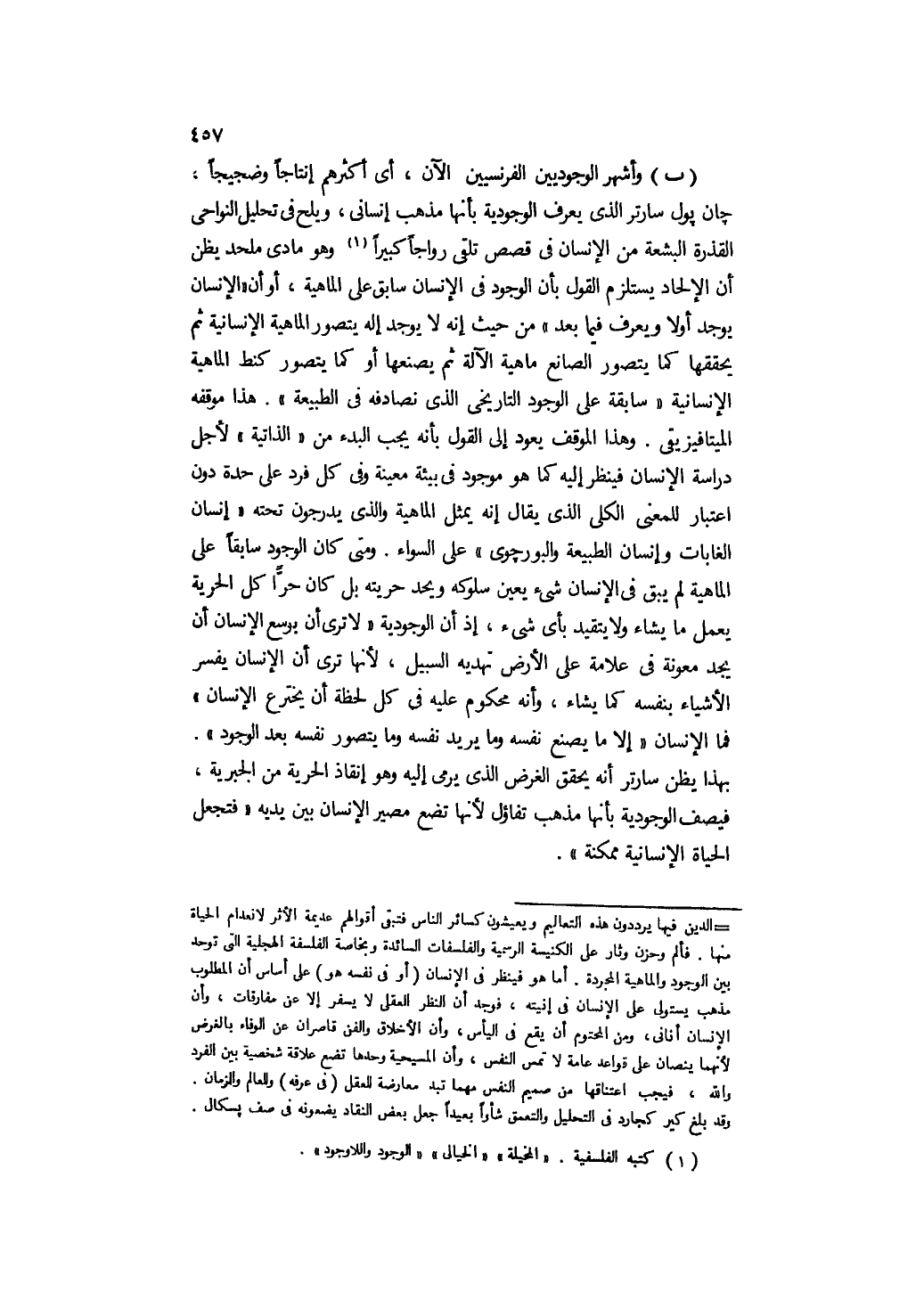 ب- وأشهر الوجوديين الفرنسيين الآن، أي: أكثرهم إنتاجًا وضجيجًا؛ جان بول سارتر الذي يعرف الوجودية بأنها مذهب إنساني، ويلح في تحليل النواحي القذرة البشعة من الإنسان في قصص تلقى رواجًا كبيرًا 1 , وهو مادي ملحد يظن أن الإلحاد يستلزم القول بأن الوجود في الإنسان سابق على الماهية، أو أن "الإنسان يوجد أولًا ويعرف فيما بعد" من حيث إنه لا يوجد إله يتصور الماهية الإنسانية ثم يحققها كما يتصور الصانع ماهية الآلة ثم يصنعها أو كما يتصور كنط الماهية الإنسانية "سابقة على الوجود التاريخي الذي نصادفه في الطبيعة". هذا موقفه الميتافيزيقي, وهذا الموقف يعود إلى القول بأنه يجب البدء من "الذاتية" لأجل دراسة الإنسان فينظر إليه كما هو موجود في بيئة معينة, وفي كل فرد على حدة دون اعتبار للمعنى الكلي الذي يقال: إنه يمثل الماهية والذي يدرجون تحته "إنسان الغابات وإنسان الطبيعة والبورجوي" على السواء. ومتى كان الوجود سابقًا على الماهية لم يبق في الإنسان شيء يعين سلوكه ويحد حريته بل كان حرا كل الحرية يعمل ما يشاء ولا يتقيد بأي شيء, إذ إن الوجودية "لا ترى أن بوسع الإنسان أن يجد معونة في علامة على الإرض تهديه السبيل؛ لأنها ترى أن الإنسان يفسر الأشياء بنفسه كما يشاء، وأنه محكوم عليه في كل لحظة أن يخترع الإنسان". فما الإنسان "إلا ما يصنع نفسه وما يريد نفسه وما يتصور نفسه بعد الوجود". بهذا يظن سارتر أنه يحقق الغرض الذي يرمي إليه وهو إنقاذ الحرية من الجبرية، فيصف الوجودية بأنها مذهب تفاؤل لأنها تضع مصير الإنسان بين يديه "فتجعل الحياة الإنسانية ممكنة".