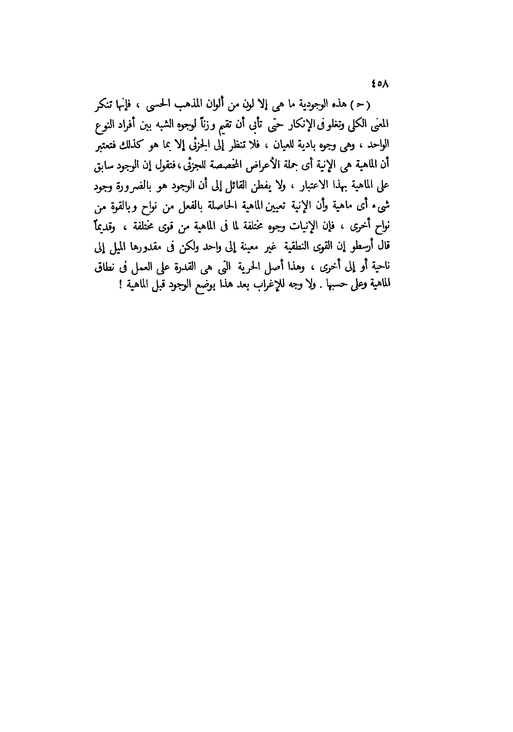 ج- هذه الوجودية ما هي إلا لون من ألوان المذهب الحسي، فإنها تنكر المعنى الكلي وتغلو في الإنكار حتى تأبى أن تقيم وزنًا لوجوه الشبه بين أفراد النوع الواحد، وهي وجوه بادية للعيان، فلا تنظر إلى الجزئي إلا بما هو كذلك فتعتبر أن الماهية هي الإنية أي: جملة الأعراض المخصصة للجزئي، فتقول: إن الوجود سابق على الماهية بهذا الاعتبار، ولا يفطن القائل إلى أن الوجود هو بالضرورة وجود شيء أي: ماهية, وأن الإنية تعيين الماهية الحاصلة بالفعل من نواحٍ وبالقوة من نواحٍ أخرى، فإن الإنيات وجوه مختلفة لما في الماهية من قوى مختلفة، وقديما قال أرسطو: إن القوى النطقية غير معينة إلى واحد ولكن في مقدورها الميل إلى ناحية أو إلى أخرى، وهذا أصل الحرية التي هي القدرة على العمل في نطاق الماهية وعلى حسبها، ولا وجه للإغراب بعد هذا بوضع الوجود قبل الماهية!