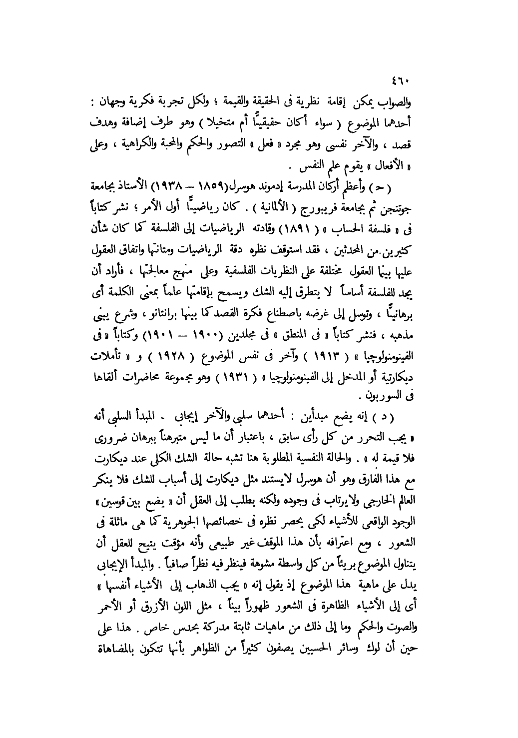 ج- وأعظم أركان المدرسة إدموند هوسرل " 1859 - 1938 " الأستاذ بجامعة جوتنجن ثم بجامعة فريبورج "الألمانية". كان رياضيًّا أول الأمر؛ نشر كتابًا في "فلسفة الحساب" " 1891 " وقادته الرياضيات إلى الفلسفة كما كان شأن كثيرين من المحدثين، فقد استوقف نظره دقة الرياضيات ومتانتها واتفاق العقول عليها, بينما العقول مختلفة على النظريات الفلسفية وعلى منهج معالجتها، فأراد أن يجد للفلسفة أساسًا لا يتطرق إليه الشك ويسمح بإقامتها علمًا بمعنى الكلمة أي: برهانيا، وتوسل إلى غرضه باصطناع فكرة القصد كما بينها برانتانو، وشرع يبني مذهبه, فنشر كتابًا "في المنطق" في مجلدين " 1900 , 1901 " وكتابًا "في الفينومنولوجيا" " 1913 " وآخر في نفس الموضوع " 1928 " و"تأملات ديكارتية أو المدخل إلى الفينومنولوجيا" " 1931 " وهو مجموعة محاضرات ألقاها في السوربون.