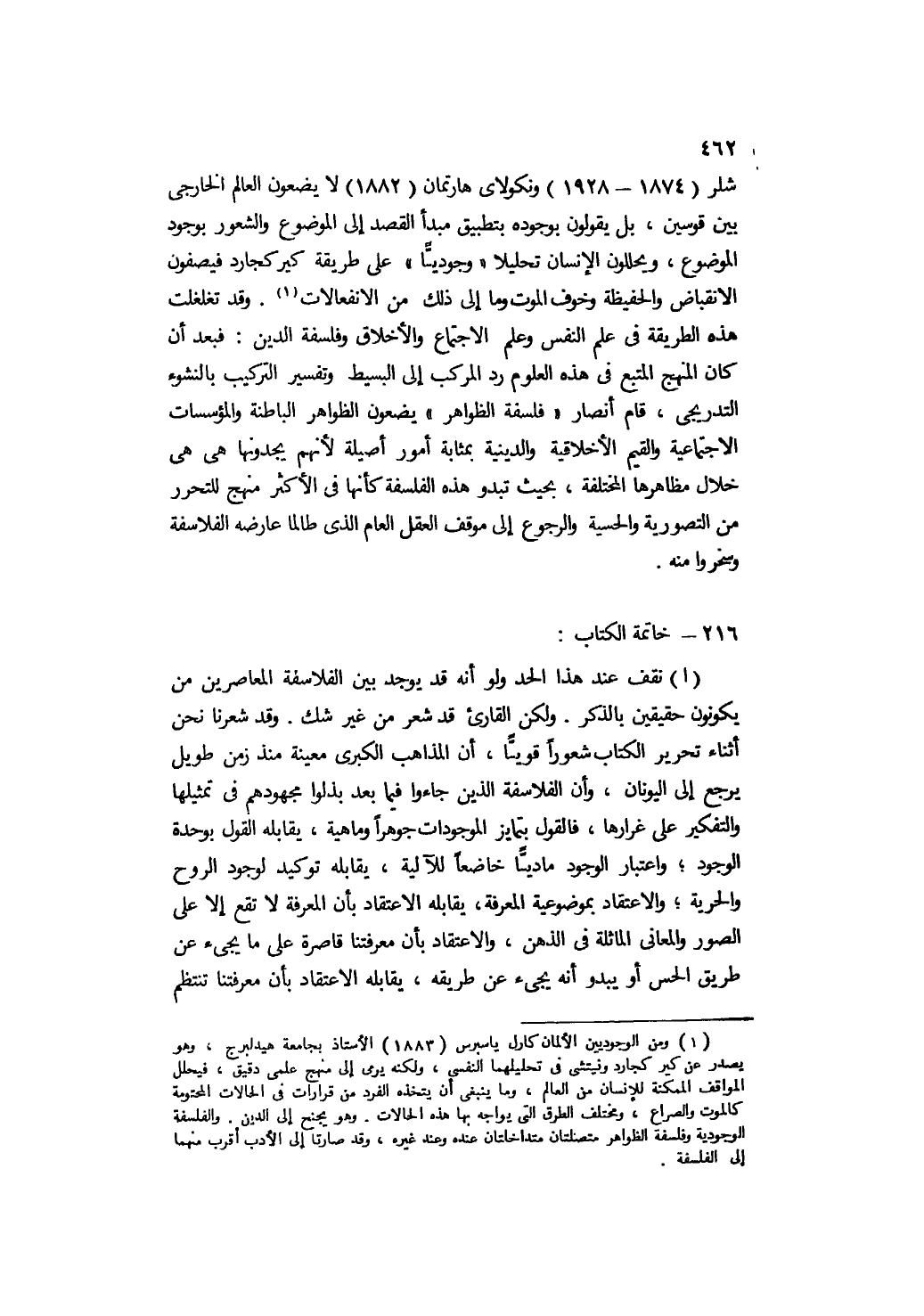 أ- نقف عند هذا الحد ولو أنه قد يوجد بين الفلاسفة المعاصرين من يكونون حقيقيين بالذكر. ولكن القارئ قد شعر من غير شك, وقد شعرنا نحن أثناء تحرير الكتاب شعورًا قويًّا أن المذاهب الكبرى معينة منذ زمن طويل يرجع إلى اليونان، وأن الفلاسفة الذين جاءوا فيما بعد بذلوا مجهودهم في تمثيلها والتفكير على غرارها، فالقول بتمايز الموجودات جوهرًا وماهية، يقابله القول بوحدة الوجود؛ واعتبار الوجود ماديًّا خاضعًا للآلية، يقابله توكيد لوجود الروح والحرية؛ والاعتقاد بموضوعية المعرفة، يقابله الاعتقاد بأن المعرفة لا تقع إلا على الصور والمعاني الماثلة في الذهن، والاعتقاد بأن معرفتنا قاصرة على ما يجيء عن طريق الحس أو يبدو أنه يجيء عن طريقه، يقابله الاعتقاد بأن معرفتنا تنتظم