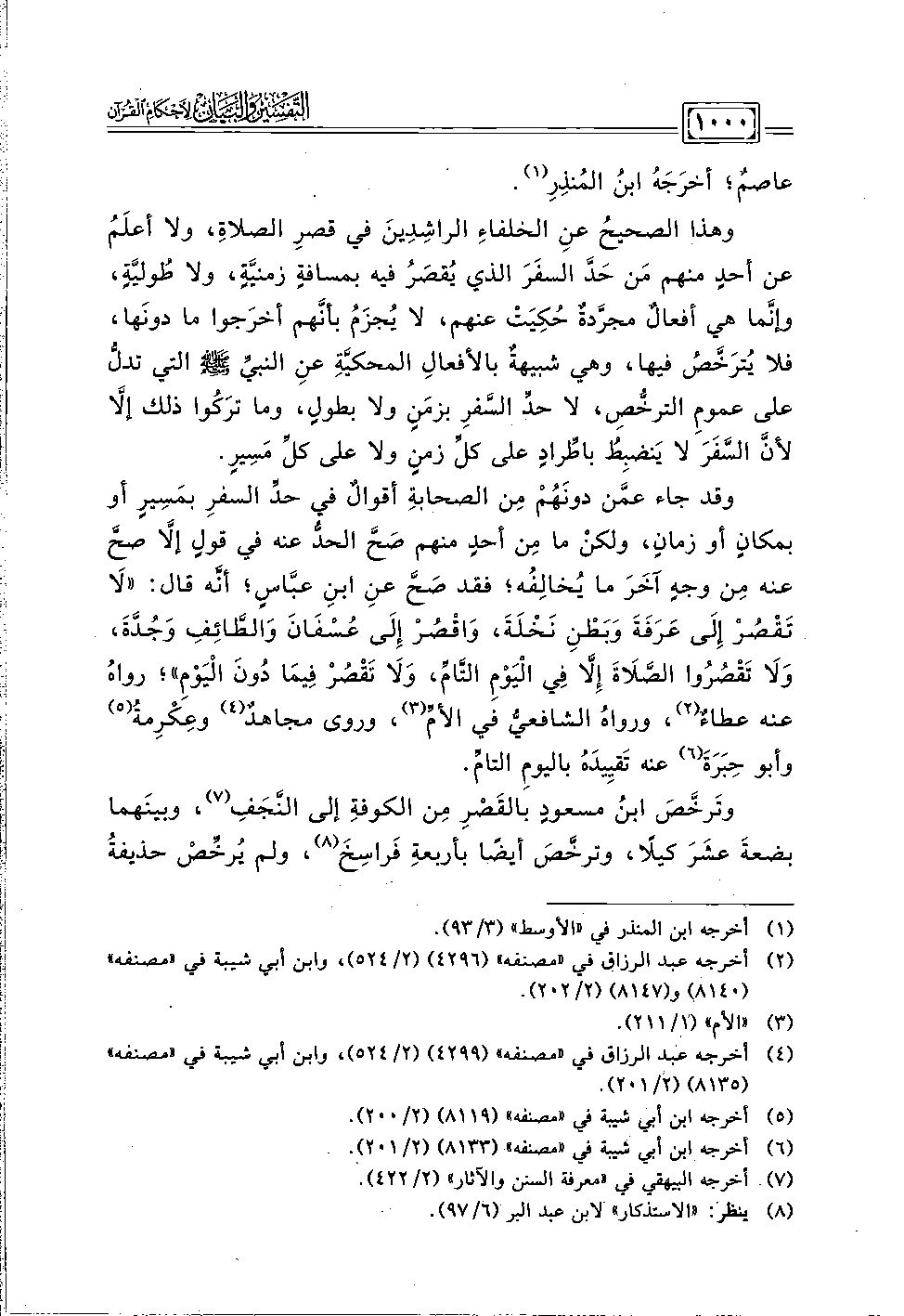 وقد جاء عمِّن دونَهُمْ مِن الصحابةِ أقوالٌ في حدِّ السفرِ بمَسِيرٍ أو بمكانٍ أو زمانٍ، ولكنْ ما مِن أحدٍ منهم صَحَّ الحدٌّ عنه في قولٍ إلَّا صحَّ عنه مِن وجهٍ آخَرَ ما يُخالِفه؛ فقد صَحَّ عنِ ابنِ عبَّاسٍ؛ أنَّه قال: "لَا تَقصُرْ إلَى عَرَفَةَ وَبَطْنِ نَخْلَةَ، وَاقصُرْ إِلَى عُسْفَانَ وَالطَّائِفِ وَجُدَّةَ، وَلَا تَقصُرُوا الصَّلَاةَ إِلا فِي الْيَوْمِ التَّامِّ، وَلَا تَقصُرْ فِيمَا دُونَ اليوْمِ"؛ رواهُ عنه عطاءٌ (٢)، ورواهُ الشافعيُّ في الأمِّ (٣)، وروى مجاهدٌ (٤) وعِكرِمةُ (٥) وأبو حِبَرَةَ (٦) عنه تَقيِيدَة باليومِ التامِّ.