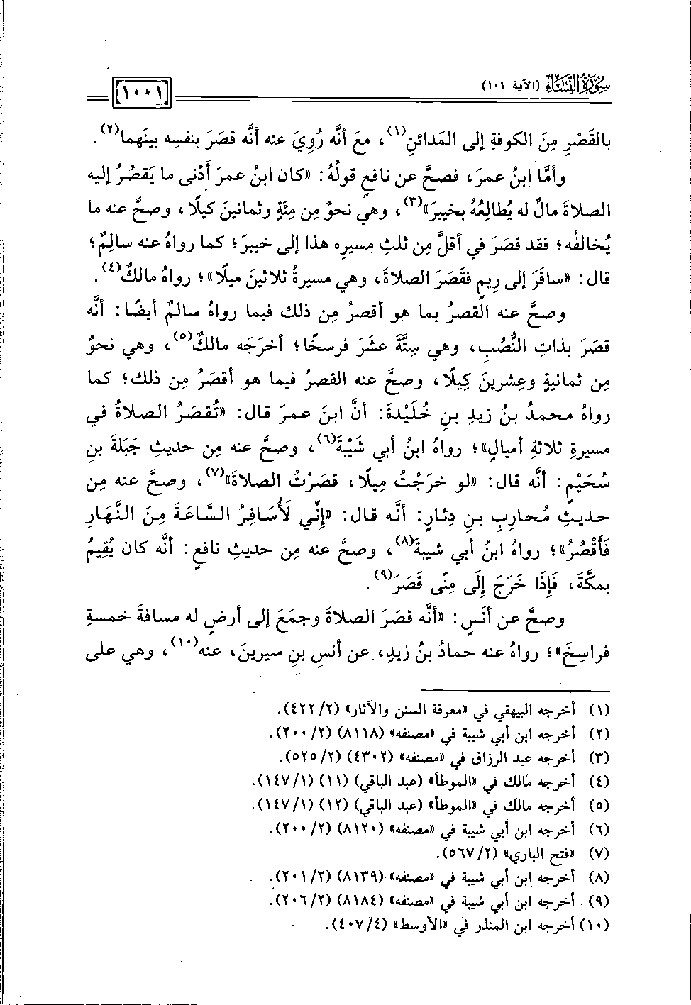 وصحَّ عنه القصرُ بما هو أقصرُ مِن ذلك فيما رواهُ سالمٌ أيضًا: أنَّه قصَرَ بذاتِ النُّصُب، وهي سِتَّةَ عشَرَ فرسخًا؛ أخرَجَه مالكٌ (٥)، وهي نحوٌ مِن ثمانيةٍ وعِشرينَ كِيلًا، وصحَّ عنه القصرُ فيما هو أقصَرُ مِن ذلك؛ كما رواهُ محمدُ بن زيدِ بنِ خلَيْدةَ: أنَّ ابنَ عمرَ قال: "تُقصَرُ الصلاةُ في مسيرةِ ثلاثةِ أميالٍ"؛ رواهُ ابنُ أبي شيْبةَ (٦)، وصحَّ عنه مِن حديثِ جَبَلةَ بنِ سُحَيْمٍ: أنَّه قال: "لو خرَجْتُ مِيلًا، فصَرْتُ الصلاةَ" (٧)، وصحَّ عنه مِن حديثِ مُحارِبِ بنِ دِثارٍ: أنَّه قال: "إِنِّي لَأُسَافِرُ السَّاعَةَ مِنَ النَّهَارِ فَأَقْصُرُ"، رواهُ ابنُ أبي شيبةَ (٨)، وصحَّ عنه مِن حديثِ نافعٍ: أنَّه كان يُقِيمُ بمكَّةَ، فَإِذَا خَرَجَ إِلَى مِنى قَصَرَ (٩).