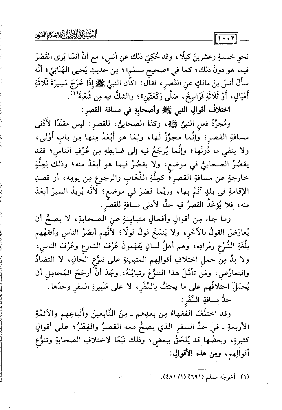 ومُجرَّدُ فعلِ النبيِّ - صلى الله عليه وسلم -، وكذا الصحابيُّ، للقصرِ: ليس مقيِّدًا لأَدْنى مسافةِ القصرِ؛ وإنَّما مجوِّزٌ لها، ولمَا هو أَبْعَدُ مِنها مِن بابِ أَوْلى، ولا ينفي ما دُونَها؛ وإنَّما يُرجَعُ فيه إلى ضابطِهِ مِن عُرْفِ الناسِ؛ ققد يقصُرُ الصحابيُّ في موضعٍ، ولا يقصُرُ فيما هو أبعَدُ منه، وذلك لِعِلَّةِ خارجةٍ عن مسافةِ القصرِ؛ كعِلَّةِ الذَّهَابِ والرجوع مِن يومِه، أو قصدِ الإقامةِ في بلدٍ أتَمَّ بها، وربَّما قصَرَ في موضعٍ؛ لَأنَّه يُريدُ السيرَ أبعَدَ منه، فلا يُؤخَذُ القصرُ فيه حدًّا لأدنى مسافةٍ للقصرِ.