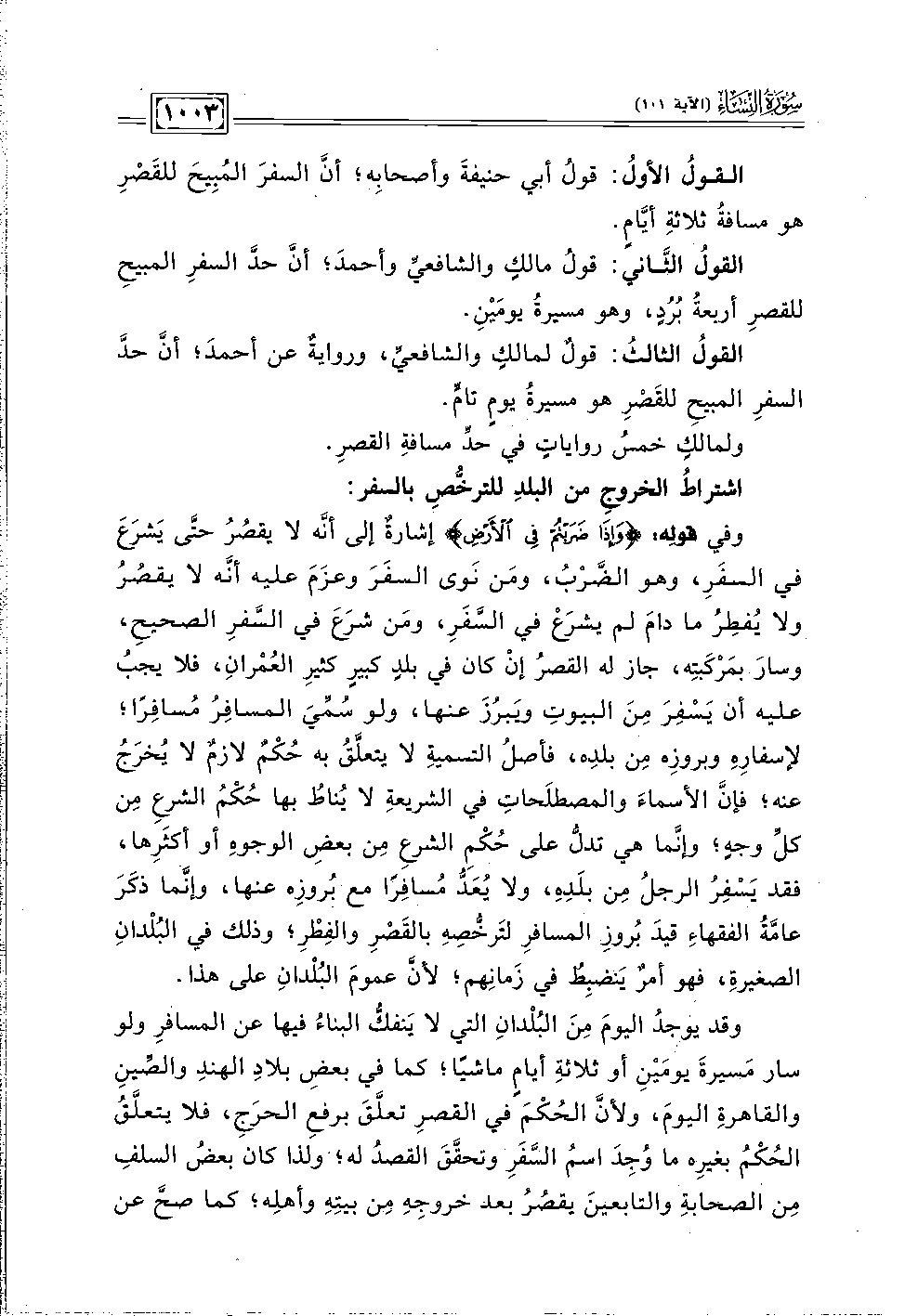 القولُ الأولُ: قولُ أبي حنيفةَ وأصحابِه؛ أنَّ السفرَ المُبِيحَ للقَصْرِ هو مسافةُ ثلاثةِ أيَّامٍ.