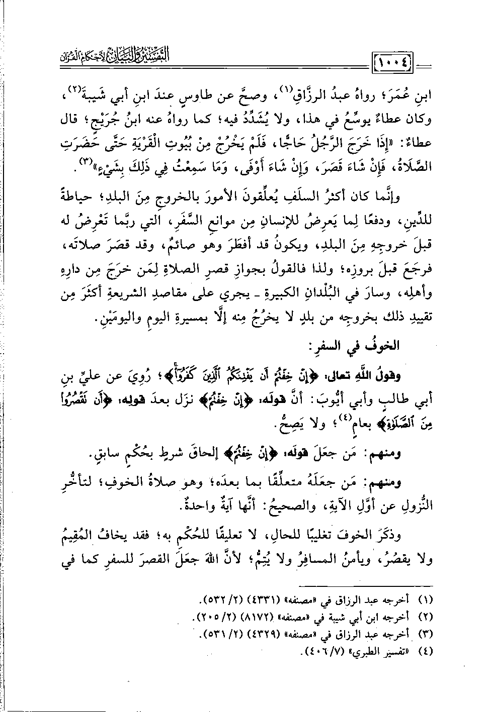 وقولُ اللَّهِ تعالى: {إِنْ خِفْتُمْ أَنْ يَفْتِنَكُمُ الَّذِينَ كَفَرُوا}؛ رُوِيَ عن عليِّ بنِ أبي طالبٍ وأبي أيُّوبَ: أنَّ قولَه {إِنْ خِفْتُمْ} نزَل بعدَ قولِه: {أَنْ تَقْصُرُوا مِنَ الصَّلَاةِ} بعامٍ (٤)، ولا يَصِحُّ.