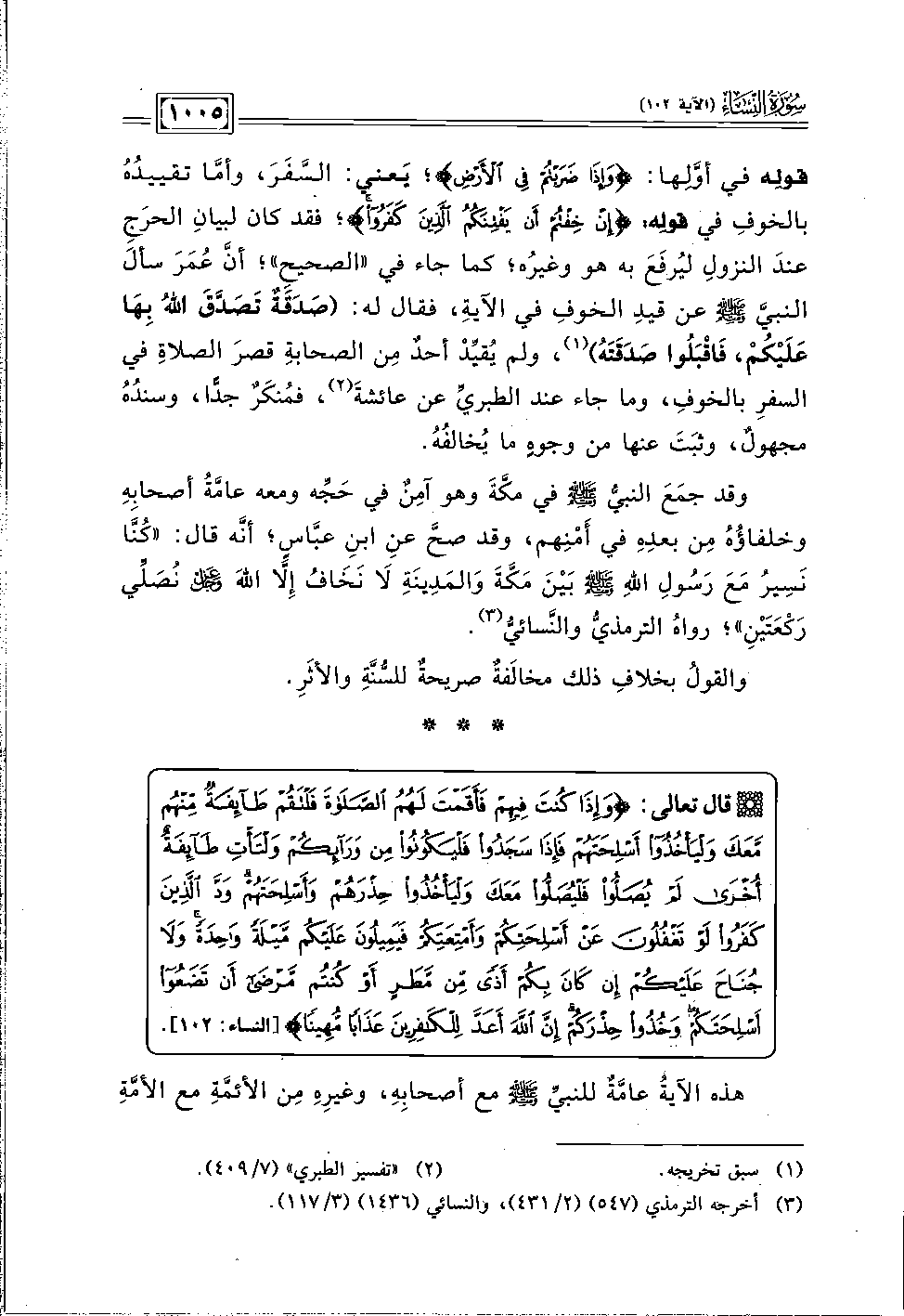 قولِه في أوَّلها: {وَإِذَا ضَرَبْتُمْ فِي الْأَرْضِ}؛ يَعني: السَّفَرَ، وأمَّا تقييدُهُ بالخوفِ في قوله: {إِنْ خِفْتُمْ أَنْ يَفْتِنَكُمُ الَّذِينَ كَفَرُوا}؛ فقد كان لبيانِ الحرَجِ عندَ النزولِ ليُرفَعَ به هو وغيرُه؛ كما جاء في "الصحيحِ"؛ أنَّ عُمَرَ سألَ النبيَّ - صلى الله عليه وسلم - عن قيدِ الخوفِ في الآية، فقال له: (صَدَقَةٌ تَصَدَّقَ اللهُ بِهَا عَلَيْكُمْ، فَاقْبَلُوا صدَقَتَهُ) (١)، ولم يُقيِّد أحدٌ مِن الصحابةِ قصرَ الصلاةِ في السفرِ بالخوفِ، وما جاء عند الطبريِّ عن عائشةَ (٢)، فمُنْكَرٌ جدًّا، وسندُهُ مجهولٌ، وثبَتَ عنها من وجوهٍ ما يُخالفُهُ.