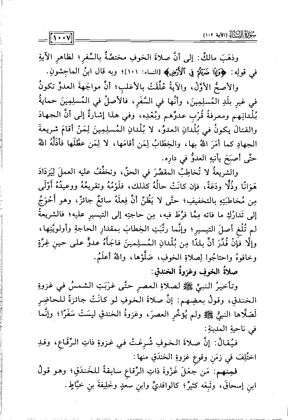 وتأخيرُ النبيِّ - صلى الله عليه وسلم - لصلاةِ العصرِ حتَّى غرَبَتِ الشمسُ في غزوةِ الخندق، وقولُ بعضِهم: إنَّ صلاةَ الخوفِ لو كانَتْ جائزةً للحاضِرِ لَصَلَّاها النبيُّ - صلي اله عليه وسلم - ولم يُؤخِّرِ العصرَ، وغزوةُ الخندقِ ليسَتْ سَفَرًا؛ وإنَّما في ناحيةِ المدينةِ: