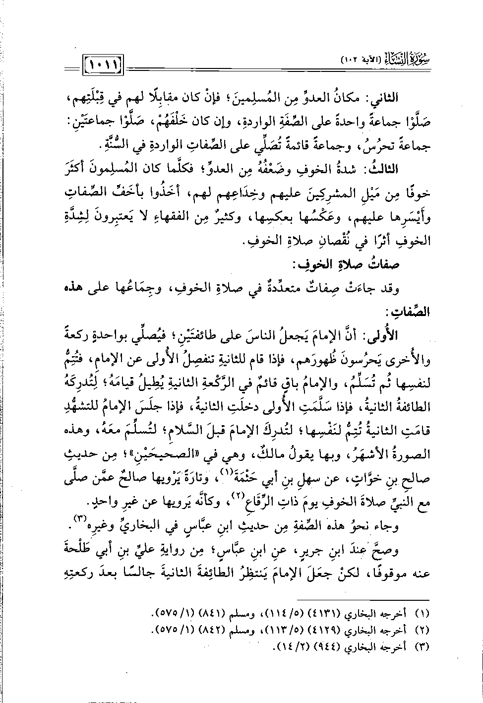 وقد جاءَت صِفاتٌ متعدِّدةٌ في صلاةِ الخوف، وجِمَاعُها على هذه الصِّفاتِ: