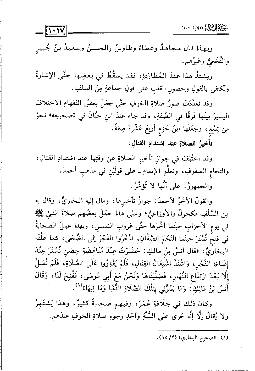 والقولُ الآخَرُ لأحمدَ: جوازُ تأخيرِها، ومال إليه البخاريُّ، وقال به مِن السَّلَفِ مكحولٌ والأوزاعيُّ؛ وعلى هذا حمَلَ بعضُهم صلاةَ النبيِّ - صلى الله عليه وسلم - في يومِ الأحزابِ حينَما أخَّرَها حتَّى غروبِ الشمس، وبهذا عمِلَ الصحابةُ في فتحِ تُسْتَرَ حينَما التَحَمَ الصَّفَّان، فأخَّرُوا الفَجْرَ إلى الضُّحَى، كما علَّقَه البخاري: "قال أنسُ بنُ مالكٍ: حَضَرْتُ عِندَ مُنَاهَضَه حِصْنِ تُسْتَرَ عِنْدَ إِضَاءَةِ الفَجْرِ، وَاشْتَدَّ اشْتِعَالُ القِتَال، فَلَمْ يَقْدِرُوا عَلَى الصَّلَاة، فَلَمْ نُصَلِّ إِلَّا بَعْدَ ارْتِفَاعِ النَّهَارِ، فَصَلَّيْنَاهَا وَنَحْنُ مَعَ أبِي مُوسَى، فَفُتِحَ لَنَا، وَقَالَ أَنَسُ بْنُ مَالِكٍ: وَمَا يَسُرُّنِي بِتِلْكَ الصَّلَاةِ الدُّنْيَا وَمَا فِيهَا" (١).