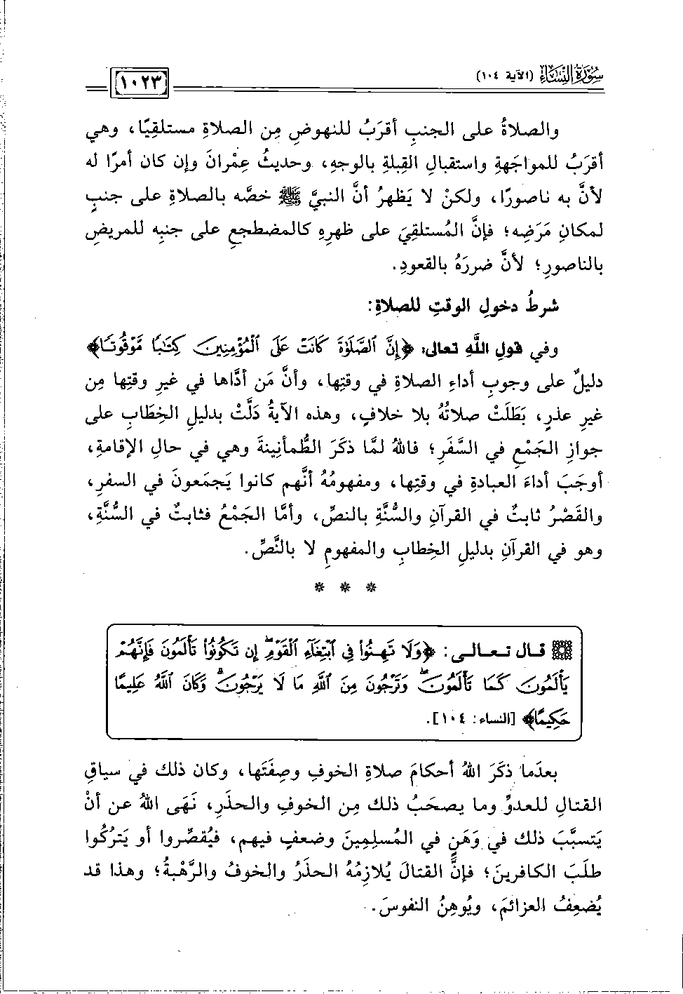 وفي قولِ اللهِ تعالى: {إِنَّ الصَّلَاةَ كَانَتْ عَلَى الْمُؤْمِنِينَ كِتَابًا مَوْقُوتًا} دليلٌ على وجوبِ أداءِ الصلاةِ في وقتِها، وأنَّ مَن أدَّاها في غيرِ وقتِها مِن غيرِ عذرٍ، بَطَلَت صلاتُهُ بلا خلافٍ، وهذه الآيةُ دَلَّتْ بدليلِ الخِطَابِ على جوازِ الجَمْعِ في السَّفَرِ؛ فاللهُ لمَّا ذكَرَ الطُّمأنِينةَ وهي في حالِ الإقامة، أوجَبَ أداءَ العبادةِ في وقتِها، ومفهومُهُ أنَّهم كانوا يَجمَعونَ في السفر، والقَصْرُ ثابتٌ في القرآنِ والسُّنَّةِ بالنصِّ، وأمَّا الجَمْعُ فثابتٌ في السُّنَّة، وهو في القرآنِ بدليلِ الخِطابِ والمفهومِ لا بالنَّصِّ.