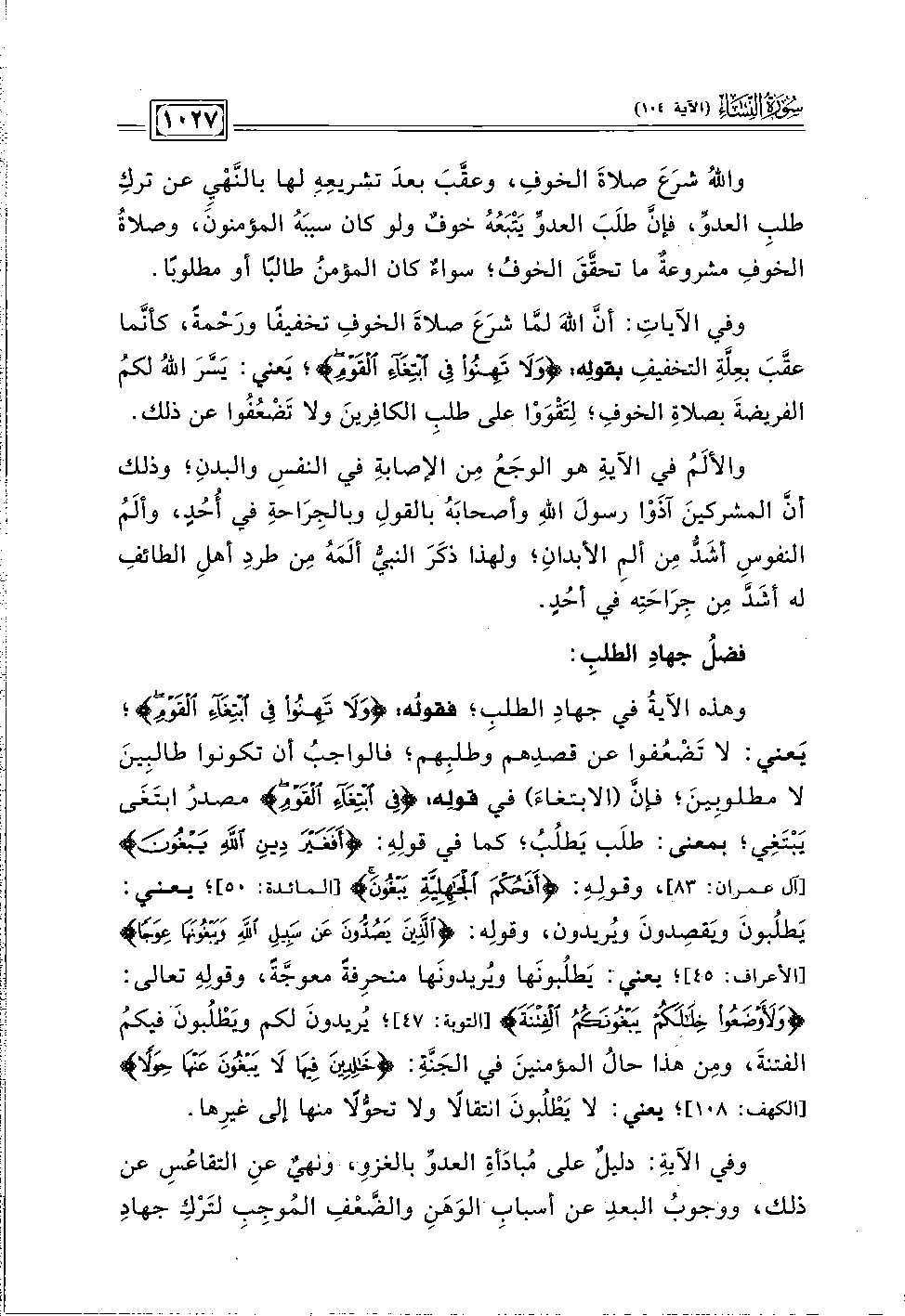 واللهُ شَرَعَ صلاةَ الخوفِ، وعقَّبَ بعدَ تشريعِهِ لها بالنَّهْيِ عن تركِ طلبِ العدوِّ، فإنَّ طلَبَ العدوِّ يَتْبَعُهُ خوفٌ ولو كان سببَهُ المؤمنونَ، وصلاةُ الخوفِ مشروعةٌ ما تحقَّقَ الخوفُ؛ سواءٌ كان المؤمنُ طالبًا أو مطلوبًا.