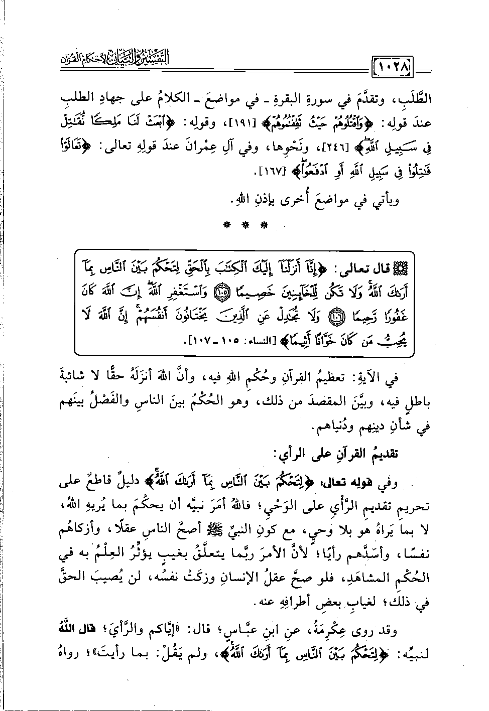 وفي قوله تعالى: {لِتَحْكُمَ بَيْنَ النَّاسِ بِمَا أَرَاكَ اللَّهُ} دليلٌ قاطعٌ على تحريمِ تقديمِ الرَّأْيِ على الوَحْيِ؛ فاللهُ أمَرَ نبيَّه أن يحكُمَ لما يُريهِ اللهُ، لا لما يَراهُ هو بلا وحيٍ، مع كونِ النبيِّ - صلى الله عليه وسلم - أصحَّ الناسِ عقلًا، وأزكاهُم نفسًا، وأسَدَّهم رأيًا؛ لأنَّ الأمرَ ربَّما يتعلَّقُ بغيبٍ يؤثِّرُ العِلْمُ به في الحُكمِ المشاهَد، فلو صحَّ عقلُ الإنسانِ وزكَتْ نفسُه، لن يُصيبَ الحقَّ في ذلك؛ لغيابِ بعضِ أطرافِهِ عنه.