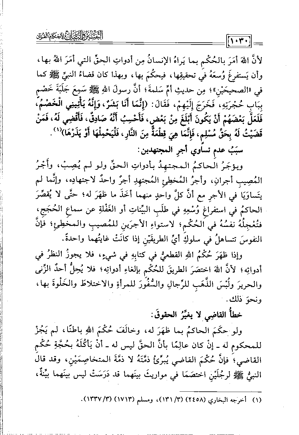 لأنَّ اللهَ أمَرَ بالحُكْمِ بما يَراهُ الإنسانُ مِن أدواتِ الحقِّ التي أمَرَ اللهُ بها، وأن يَستفرِغَ وُسعَهُ في تحقيقِها، فيحكُمَ بها، وبهذا كان قصاءُ النبيِّ - صلى الله عليه وسلم - كما في "الصحيحَينِ"، مِن حديثِ أمِّ سَلمةَ؛ أنَّ رسولَ اللهِ - صلى الله عليه وسلم - سَمِعَ جَلَبَةَ خَصْمٍ بِبَابِ حُجْرَتِه، فَخَرَجَ إِلَيْهِمْ، فَقَالَ: (إِنَّمَا أَنَا بَشَرٌ، وَإِنَّهُ يَأْتِينِي الْخَصْمُ، فَلَعَلَّ بَعْضَهُمْ أَنْ يَكُونَ أَبْلَغَ مِنْ بَعْضٍ، فَأَحْسِبُ أَنَّهُ صَادِقٌ، فَأَقْضِي لَهُ، فَمَنْ قَضَيتُ لَهُ بِحَقِّ مَسْلِمٍ، فَإنَّمَا هِيَ قِطْعَةٌ مِنَ النَّار، فَلْيَحْمِلْهَا أَوْ يَذَرْهَا) (١).