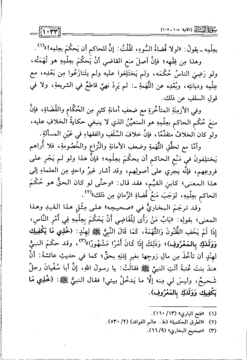 وقد ترجَمَ البخاريُّ في "صحيحِه" على مِثلِ هذا القيدِ وهذا المعنى؛ بقولِه: "بَابُ مَنْ رَأَى لِلْقَاضِي أَنْ يَحْكُمَ بِعِلْمِهِ فِي أَمْرِ النَّاس، إِذَا لَمْ يَخَفِ الظُّنُونَ وَالتُّهَمَةَ، كَمَا قَالَ النَّبِيُّ - صلى الله عليه وسلم - لِهِنْدٍ: (خُذِي مَا يَكْفِيكِ وَوَلَدَكِ بِالمَعْرُوفِ)؛ وَذَلِكَ إِذَا كَانَ أمْرًا مَشْهُورًا" (٣)، وقد حكَمَ النبيُّ لهنْدٍ أن تأخُذَ مِن مالِ زوجِها بغيرِ إذنِهِ بحقٍّ؛ كما في حديثِ عائشةَ: أنَّ هندَ بنتَ عُتبةَ أتَتِ النبيَّ - صلى الله عليه وسلم - فقالَتْ: يا رسولَ الله، إنَّ أبا سُفْيانَ رجلٌ شَحيحٌ، وليسَ لي مِنه إلَّا ما يَدخُلُ بيتي! فقال النبيُّ - صلى الله عليه وسلم -: (خُذِي مَا يَكْفِيكِ وَوَلَدَكِ بِالمَعْرُوفِ).