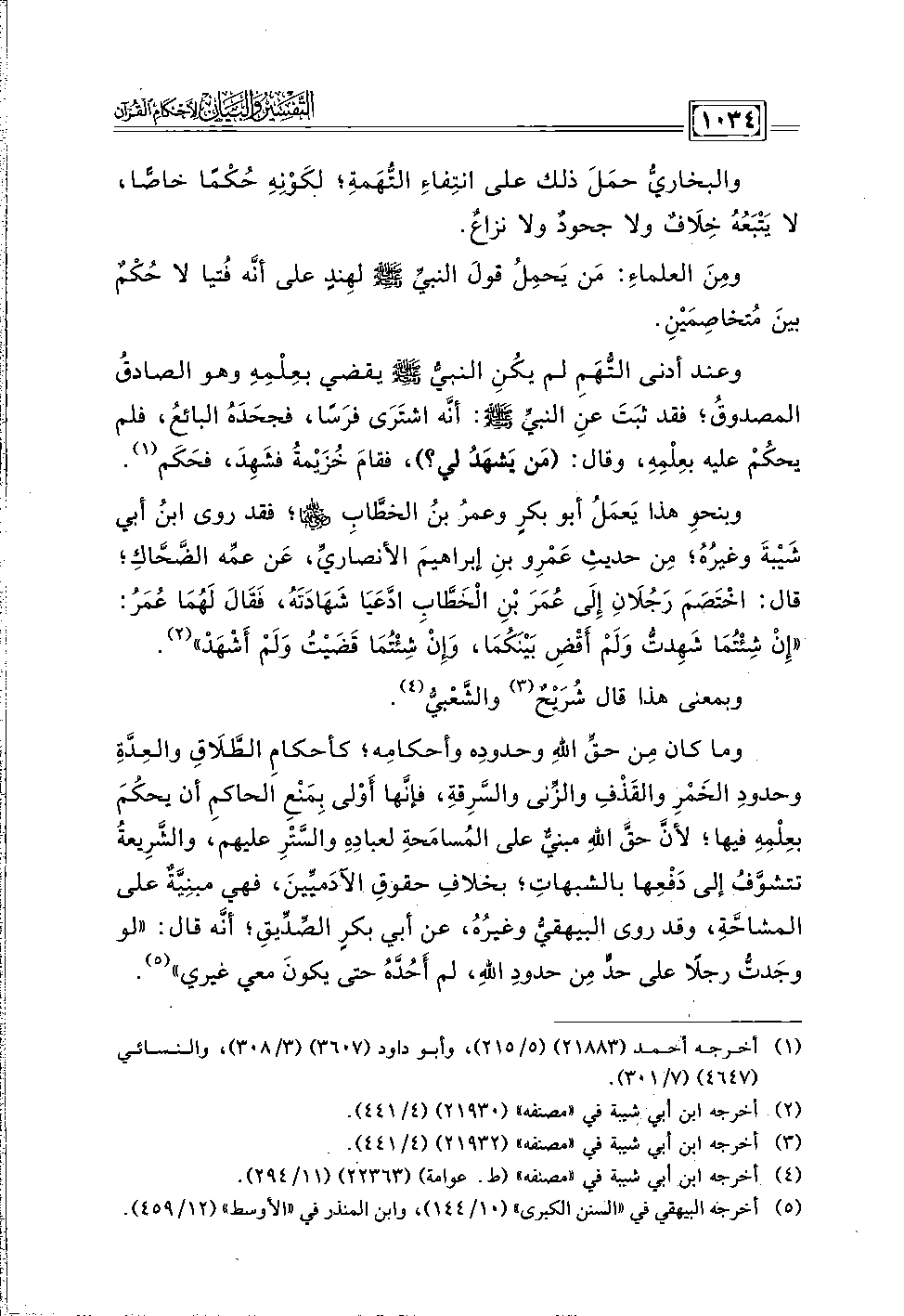 وما كان مِن حقِّ اللهِ وحدودِه وأحكامِه؛ كأحكامِ الطَّلَاقِ والعِدَّةِ وحدودِ الخَمْرِ والقَذْفِ والزِّنى والسَّرِقة، فإنَّها أَوْلى بِمَنعِ الحاكمِ أن يحكُمَ بعِلْمِهِ فيها؛ لأنَّ حقَّ اللهِ مبنيٌّ على المُسامَحةِ لعبادِهِ والسَّتْرِ عليهم، والشِّرِيعةُ تتشوَّفُ إلى دَفْعِها بالشبهاتِ؛ بخلافِ حقوقِ الآدَميِّينَ، فهي مبنِيَّةٌ على المشاحَّةِ، وقد روى البيهقيُّ وغيرُهُ، عن أبي بكرٍ الصِّدِّيقِ؛ أنَّه قال: "لو وجَدتُ رجلًا على حدٍّ مِن حدودِ الله، لم أَحُدَّهُ حتى يكونَ معي غيري" (٥).