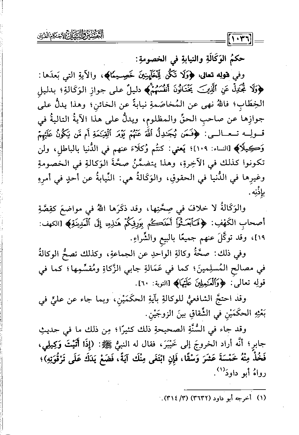 وفي قوله تعالى: {وَلَا تَكُنْ لِلْخَائِنِينَ خَصِيمًا}، والآيةِ التي بَعدَها: {وَلَا تُجَادِلْ عَنِ الَّذِينَ يَخْتَانُونَ أَنْفُسَهُمْ} دليلٌ على جوازِ الوَكَالةِ؛ بدليلِ الخِطَاب؛ فاللهُ نهى عن المخاصَمةِ نيابةً عن الخائنِ؛ وهذا يدلُّ على جوازِها عن صاحب الحقِّ والمظلوم، ويدلُّ على هذا الآية التاليةُ في قولِه تعالى: {فَمَنْ يُجَادِلُ اللَّهَ عَنْهُمْ يَوْمَ الْقِيَامَةِ أَمْ مَنْ يَكُونُ عَلَيْهِمْ وَكِيلًا} [النساء: ١٠٩]؛ يَعني: كنتُم وُكلَاءَ عنهم في الدُّنيا بالباطل، ولن تكونوا كذلك في الآخِرة، وهذا يتضمِّنُ صحَّةَ الوَكالةِ في الخصومةِ وغيرِها في الدُّنيا في الحقوق، والوَكَالةُ هي: النِّيابةُ عن أحدٍ في أمرِهِ بإِذْنِه.