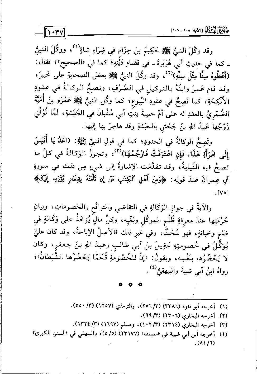 والآيةُ في جوازِ الوَكَالةِ في القاضي والترافُعِ والخصومات، وبيانِ حرْمَتِها عندَ معرِفةِ ظُلْمِ الموكِّلِ وبَغيِه، وكلُّ مالٍ يُؤخَذُ على وَكَالةٍ في ظلمٍ وخيانةٍ، فهو سُحْتٌ، وفي غيرِ ذلك فالأصلُ الإباحةُ، وقد كان عليٌّ يُوَكَّلُ في خُصومِتهِ عَقِيلَ بنَ أبي طالبٍ وعبدَ اللهِ بنَ جعفرٍ، وكان لا يَحْضُرُها بنَفْسِه، ويقولُ: "إنَّ للخُصُومةِ قُحَمًا يَحْضُرُها الشيطانُ"؛ رواهُ ابنُ أبي شيبةَ والبيهقيُّ (٤).