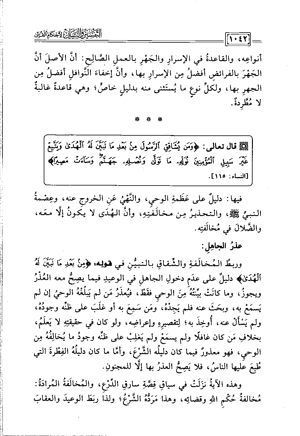 وربطُ المخالَفةِ والشِّقاقِ بالتبيُّنِ في قوله: {مِنْ بَعْدِ مَا تَبَيَّنَ لَهُ الْهُدَى} دليلٌ على عدَمِ دخولِ الجاهلِ في الوعيدِ فيما يصِحُّ معه العُذْرُ ويجوزُ، وما كانَت بيِّنتُهُ مِنَ الوحيِ فقَطْ، فيُعذَرُ مَن لم يَبلُغهُ الوحيُ إن لم يَسمَعْ به، وبحَثَ عنه فلم يَجِدْهُ، ومَن سَمِعَ به أو غَلَب على ظَنِّه وجودُهُ، ولم يَسْأَلْ عنه، أُوخِذَ به؛ لِتقصيرِهِ وإعراضِه، ولو كان في حقيقتِهِ لا يَعلَمُ، بخلافِ مَن كان غافلًا ولم يسمَعُ ولم يَغلِبْ على ظنِّه وجودُ ما يُخالِفُهُ مِن الوحي، فهو معذورٌ فيما كان دليلُه الشَّرْعَ، وأمَّا ما كان دليلُهُ الفِطْرةَ التي طُبعَ عَليها الناسُ، فلا يَصِحُّ العذرُ بها إلَّا للمجنونِ.