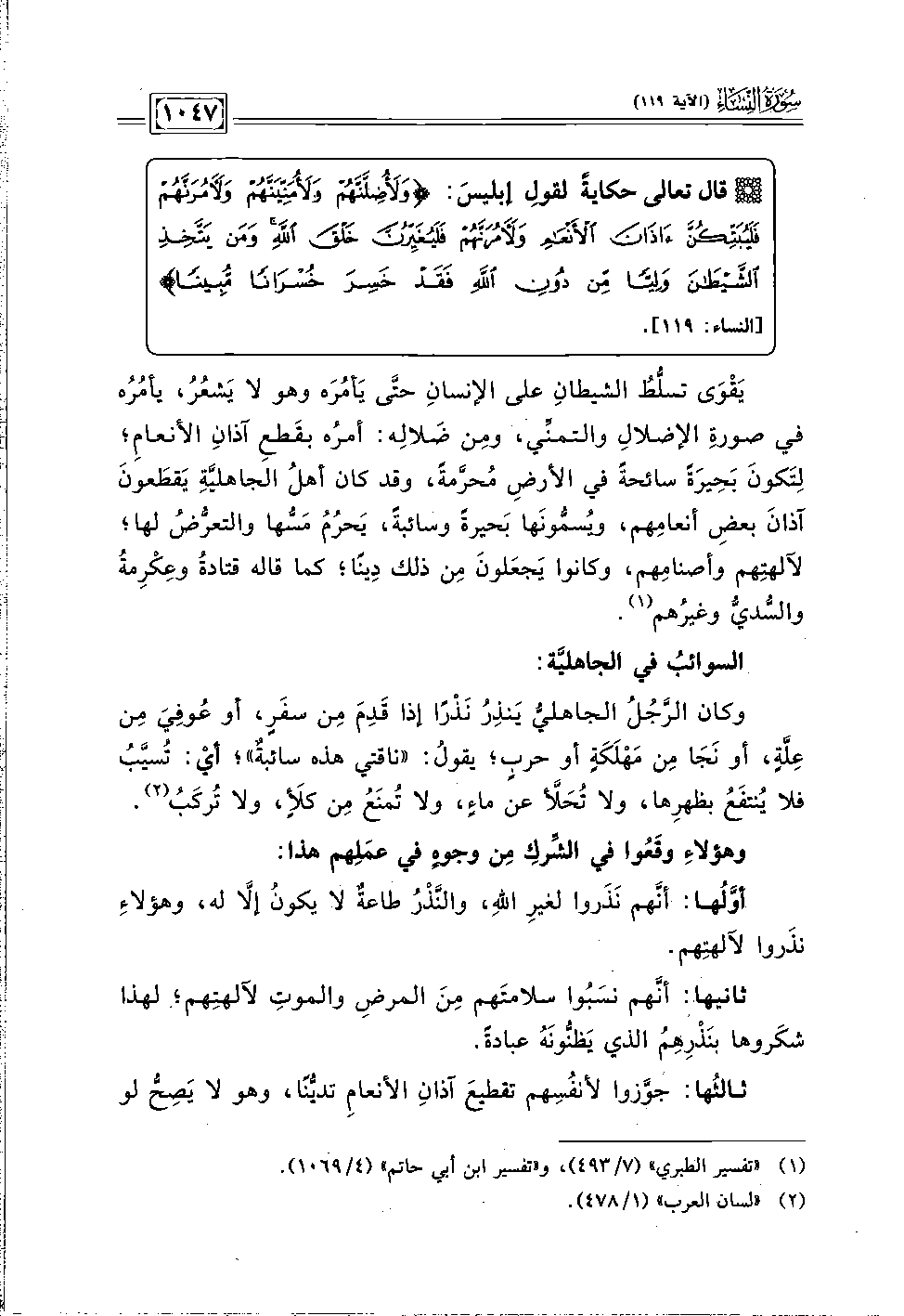 يَقْوَى تسلُّطُ الشيطانِ على الإنسانِ حتَّى يَأمُرَه وهو لا يَشعُرُ، يأمُره في صورةِ الإضلالِ والتمنِّي، ومِن ضَلالِه: أمرُه بقَطعِ آذانِ الأنعامِ؛ لِتَكونَ بَحِيرَةً سائحةً في الأرضِ مُحرَّمةً، وقد كان أهلُ الجاهليَّةِ يَقطَعونَ آذانَ بعضِ أنعامِهم، ويُسمُّونَها بَحيرةً وسائبةً، يَحرُمُ مَسُّها والتعرُّضُ لها؛ لآلهتِهم وأصنامِهم، وكانوا يَجعَلونَ مِن ذلك دِينًا، كما قاله قتادةُ وعِكرِمةُ والسُّديُّ وغيرُهم (١).