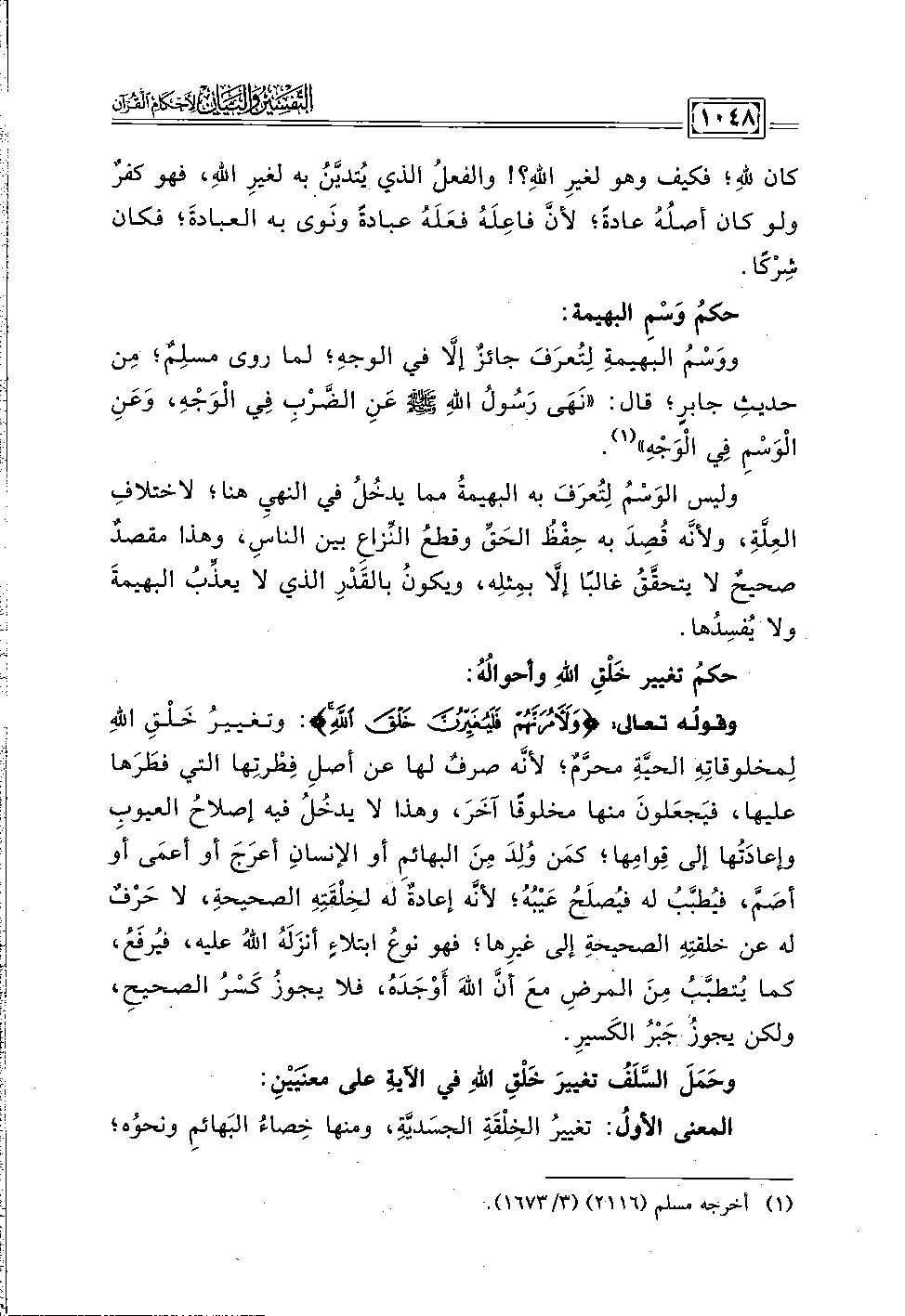 وقولُه تعالى: {وَلَآمُرَنَّهُمْ فَلَيُغَيِّرُنَّ خَلْقَ اللَّهِ} وتغييرُ خَلْقِ اللهِ لِمخلوقاتِهِ الحيَّةِ محرَّمٌ؛ لأنه صرفٌ لها عن أصلِ فِطْرتِها التي فطَرَها عليها، فيَجعَلونَ منها مخلوقًا آخَرَ، وهذا لا يدخُل فيه إصلاحُ العيوبِ وإعادَتُها إلى قِوامِها؛ كمَن وُلدَ مِنَ البهائم أو الإنسانِ أعرَجَ أو أعمَى أوَ أصَمَّ، فيُطبَّب له فيُصلَحُ عَيْبُهُ، لأنَّه إعادةٌ له لخِلْقَتِهِ الصحيحة، لا حَرْفٌ له عن خلفتِهِ الصحيحة إلى غيرِها؛ فهو نوع ابتَلاءٍ أنزَلَه اللهُ عليه، فيُرفَعُ، كما يُتطبَّب مِنَ المرضِ معَ أنَّ اللهَ أَوْجَدَهُ، فلا يجوز كَسْرُ الصحيح، ولكن يجوزُ جَبْرُ الكَسيرِ.
