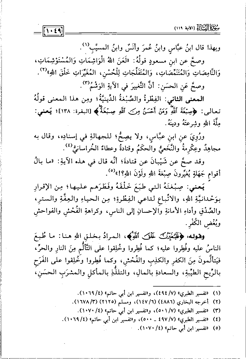 وقد صحَّ عن شَيْبانَ عن قتَادةَ؛ أنَّه قال في هذه الآيةِ: "ما بالُ أقوامٍ جَهَلةٍ يُغيِّرونَ صِبغةَ اللهِ ولَوْنَ اللهِ؟ ! " (٥).