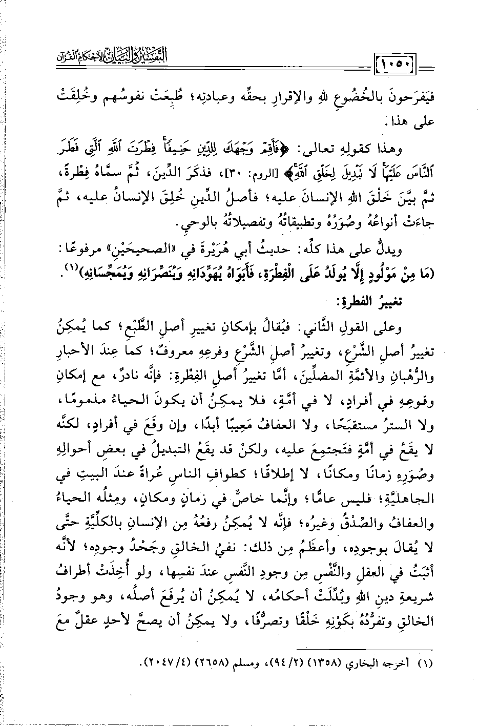 وهذا كقولِهِ تعالى: {فَأَقِمْ وَجْهَكَ لِلدِّينِ حَنِيفًا فِطْرَتَ اللَّهِ الَّتِي فَطَرَ النَّاسَ عَلَيْهَا لَا تَبْدِيلَ لِخَلْقِ اللَّهِ} [الروم: ٣٠]، فذكَرَ الدِّينَ، ثمَّ سمَّاهُ فِطْرةً، ثمَّ بيَّنَ خَلْقَ اللهِ الإنسانَ عليه؛ فأصلُ الدِّينِ خُلِقَ الإنسانُ عليه، ثُمَّ جاءَتْ أنواعهُ وصُوَرهُ وتطبيقاتُهُ وتفصيلاتُهُ بالوحيِ.