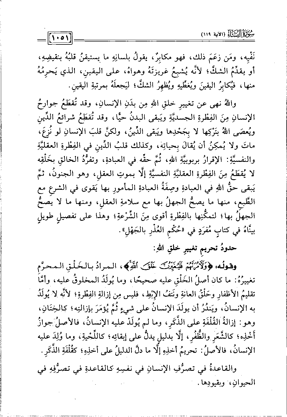 وقوله: {وَلَآمُرَنَّهُمْ فَلَيُغَيِّرُنَّ خَلْقَ اللَّهِ}، المرادُ بالخَلْقِ المحرَّمِ تغييرُهُ: ما كان أصلُ الخَلْقِ عليه صحيحًا، وما يُولَدُ المخلوق عليه، وأمَّا تقليمُ الأظفارِ وحَلْقُ العانةِ ونَتفَ الإِبْط، فليس مِن إزالةِ الفِطْرةِ؛ لأنَّه لا يُولَدُ به الإنسانُ، ويَندُرُ أن يولَدَ الإنسانُ على شيءٍ ثُمَّ يُؤمَرَ بإزالتِه؛ كالخِتَان، وهو: إزالةُ القُلْفَةِ على الذَّكَر، وما يُولَدُ عيه الإنسانُ، فالأصلُ جوازُ أخذِه؛ كالشَّعرِ والظُّفُر، إلَّا بدليل يدلُّ على إبقائِه، كاللِّحْية، وما وُلدَ عليه الإنسانُ، فالأصلُ: تحريم أخذِهِ إلَّا ما دلَّ الدليلُ على أخذِهِ؛ كقُلْفَةِ الذَّكَرِ.