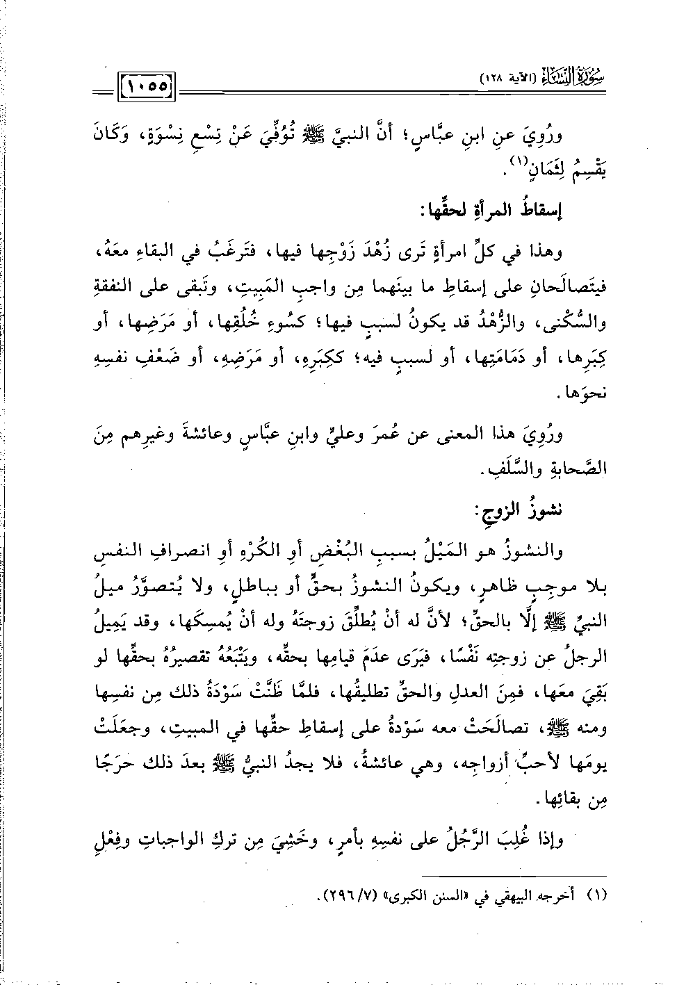 وهذا في كلِّ امرأةٍ تَرى زُهْدَ زَوْجِها فيها، فتَرغَب في البقاءِ معَهُ، فيتَصالَحانِ على إسقاطِ ما بينَهما مِن واجبِ المَبِيت، وتَبقى على النفقةِ والسُّكْنى، والزُّهْد قد يكونُ لسببٍ فيها؛ كسُوءِ خلُقِها، أو مَرَضِها، أو كِبَرِها، أو دَمَامَتِها، أو لسببٍ فيه؛ ككِبَرِه، أو مَرَضِه، أو ضَعْفِ نفسِهِ نحوَها.