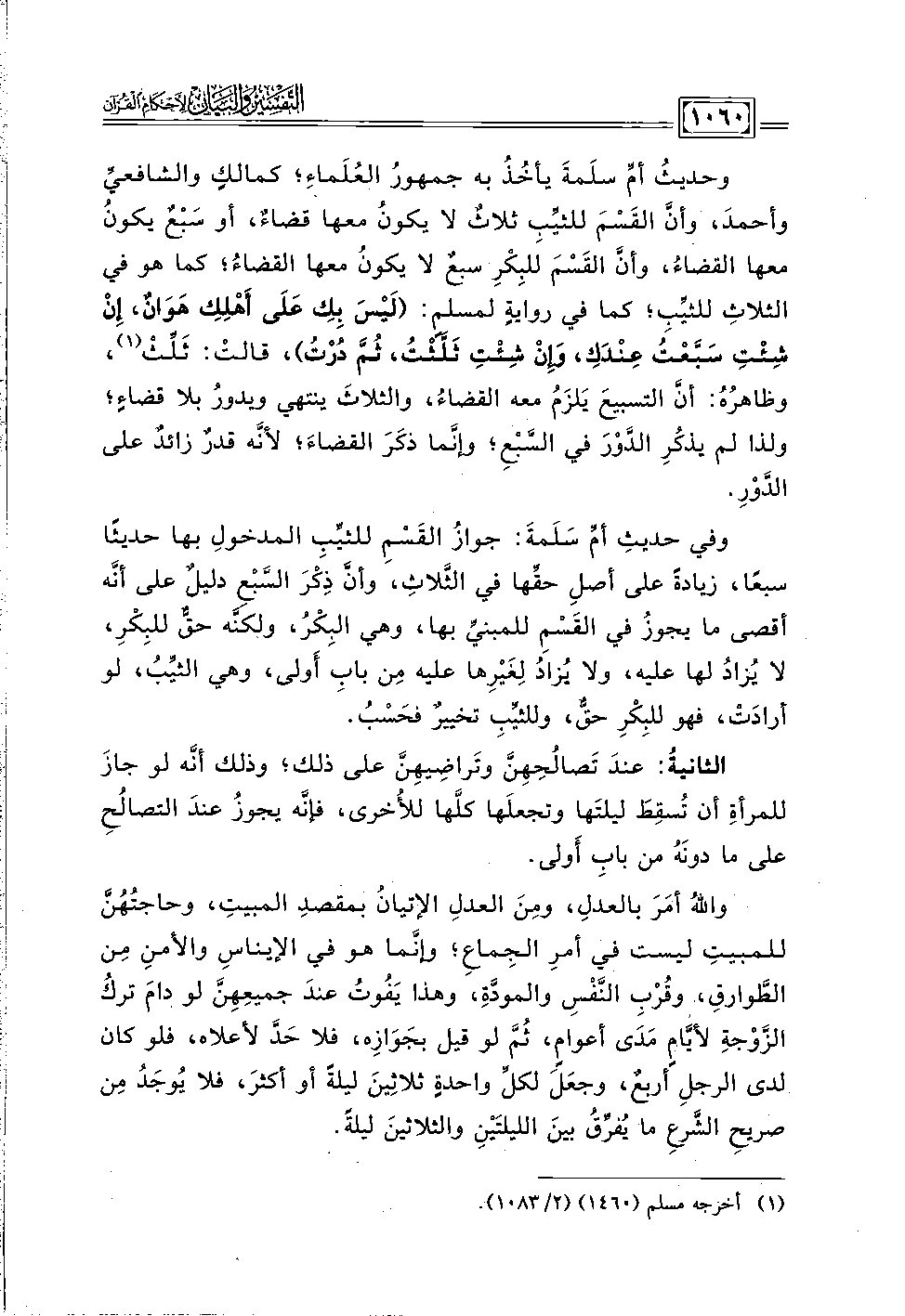 وحديثُ أمِّ سلَمةَ يأخذُ به جمهورُ العُلَماءِ؛ كمالكٍ والشافعيِّ وأحمدَ، وأنَّ القَسْمَ للثَّيِّبِ ثلاثٌ لا يكونُ معها قضاءٌ، أو سبعٌ يكونُ معها القضاء، وأن القَسْمَ للبِكرِ سبعٌ لا يكون معها القضاءُ! كما هو في الثلاث: للثَّيِّبِ؛ كما في روايةٍ لمسلمٍ: (لَيْسَ بِكِ عَلَى أَهْلِكِ هَوَانٌ، إِنْ شِئْتِ سَبَّعْتُ عِنْدَك، وَإِنْ شِئْتِ ثَلَّثْتُ، ثُمَّ دُرْتُ)، قالت: ثَلِّثْ (١)، وظاهرهُ: أنَّ التسبيعَ يَلزَمُ معه الفضاءُ، والثلاثَ ينتهي ويدورُ بلا قضاءٍ؛ ولذا لم يذكُرِ الدَّوْرَ في السَّبْعِ؛ وإنَّما ذكَرَ القضاءَ؛ لأنَّه قدرٌ زائدٌ على الدَّوْرِ.