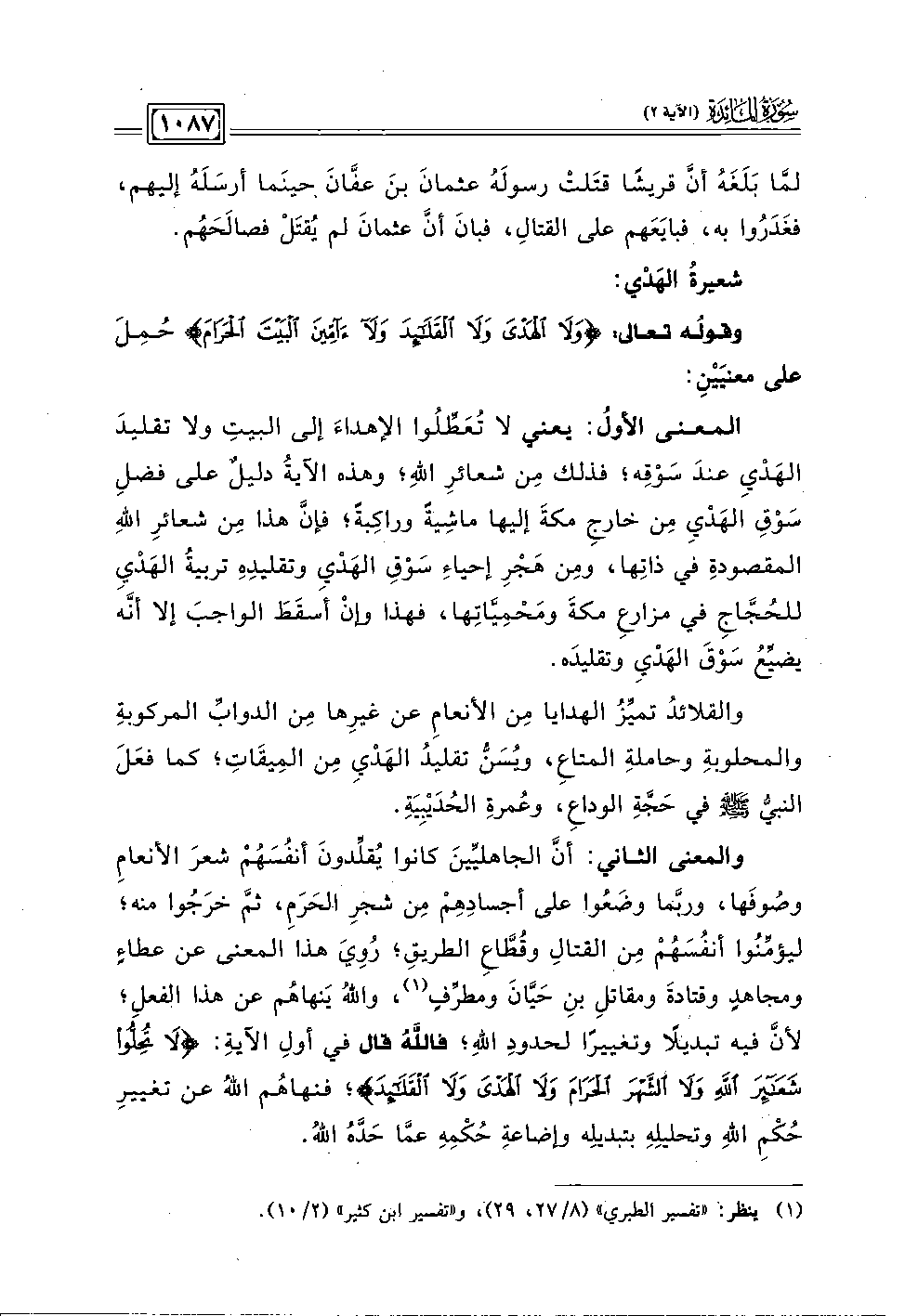المعنى الأول: يعني لا تُعَطِّلُوا الإهداءَ إلى البيتِ ولا تقليدَ الهَدْيِ عندَ سَوْقِه؛ فذلك مِن شعائرِ اللهِ؛ وهذه الآيةُ دليلٌ على فضلِ سَوْقِ الهَدْيِ مِن خارجِ مكَّةَ إليها ماشِيةً وراكِبةً؛ فإنَّ هذا مِن شعائرِ اللهِ المقصودةِ في ذاتِها، ومِن هَجْرِ إحياءِ سَوْقِ الهَدْي وتقليدِهِ تربيةُ الهَدْيِ للحُجَّاجِ في مزارعِ مكةَ ومَحْمِيَّاتِها، فهذا وإن أَسقَطَ الواجبَ إلا أنه يضيِّعُ سَوْقَ الهَدْيِ وتقليدَه.