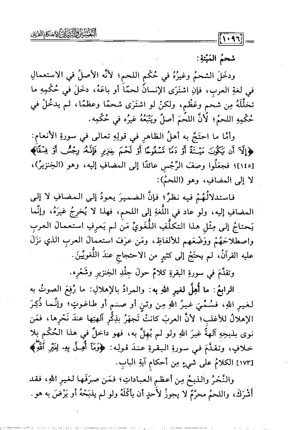 فاستدلالُهم فيه نظر؛ فإنَّ الضميرَ يعود إلى المضافِ لا إلى المضافِ إليه، ولو عاد في اللغةِ إلى اللحم، فهذا لا يُخرِج غيرَهُ، وإنَّما يَحتاجُ إلى مِثلِ هذا التكلُّفِ اللُّغَويِّ مَن لم يَعرِفِ استعمال العربِ واصطلاحَهُم ووَضعَهم للألفاظ، ومَن عرَفَ استعمال العربِ الذي نزَلَ عليه القرآن، لم يحتَجْ إلى كثيرٍ من الاحتجاجِ عندَ اللُّغويِّينَ.