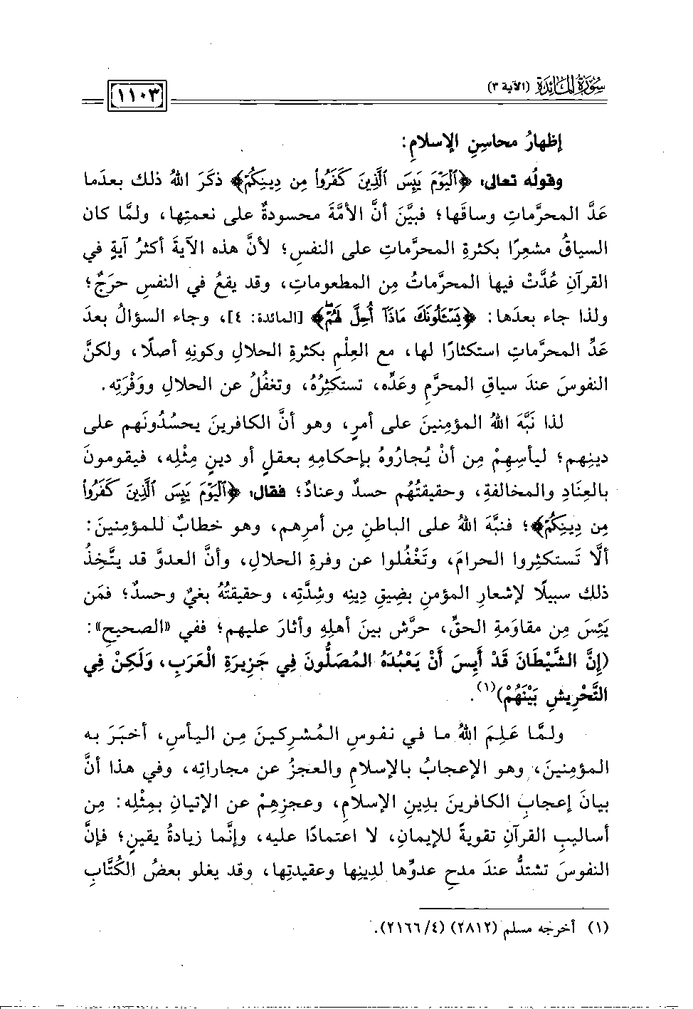 لذا نَبَّهَ الله المؤمِنينَ على أمرٍ، وهو أن الكافرينَ يحسدُونهم على دينِهم، ليأسِهِمْ مِن أن يُجارُوه بإحكامِهِ بعقلٍ أو دينٍ مِثلِه، فيقومون بالعِنادِ والمخالفة، وحقيقتهم حسدٌ وعنادٌ؛ فقال {الْيَوْمَ يَئِسَ الَّذِينَ كَفَرُوا مِنْ دِينِكُمْ}؛ فنبَّهَ الله على الباطنِ مِن أمرِهم، وهو خطابٌ للمؤمِنينَ؛ ألا تَستكثِروا الحرامَ، وتَغفُلوا عن وفرةِ الحلال، وأنَّ العدوَّ قد يتَّخِذُ ذلك سبيلًا لإشعارِ المؤمنِ بضِيقِ دِينه وشدَّتِه، وحقيقتُهُ بغيٌ وحسدٌ؛ فمَن يَئِسَ مِن مقاوَمةِ الحقّ، حرَّش بينَ أهلِهِ وآثارَ عليهم؛ ففي "الصحيحِ": (إِنَّ الشَّيْطَانَ قَد أيِسَ أن يَعبُدَه المُصَلُّونَ فِي جَزيرَةِ الْعَرَب، وَلَكِنْ فِي التَّحْرِيش بَيْنَهُمْ) (١).