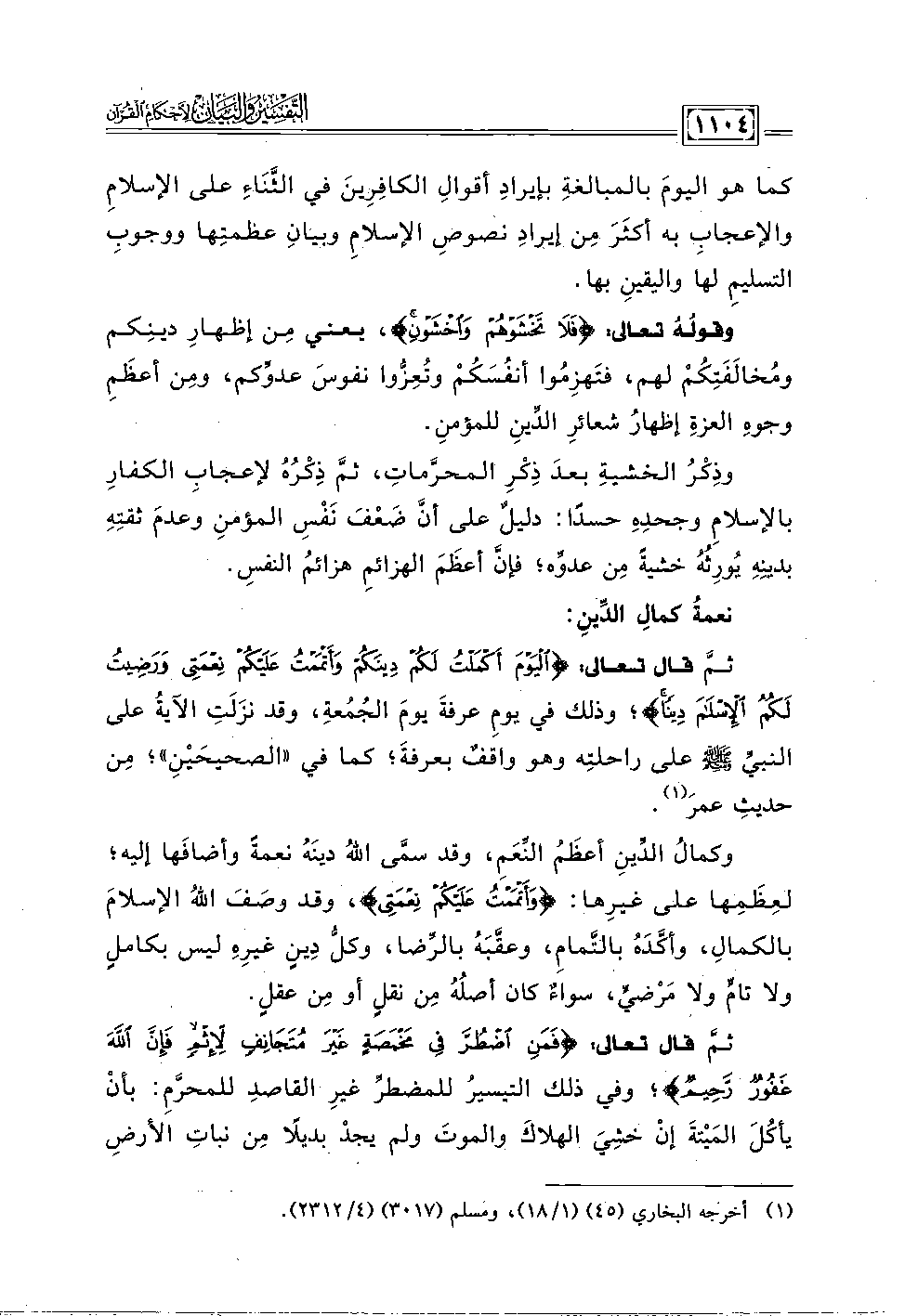ثم قال تعالى: {الْيَوْمَ أَكْمَلْتُ لَكُمْ دِينَكُمْ وَأَتْمَمْتُ عَلَيْكُمْ نِعْمَتِي وَرَضِيتُ لَكُمُ الْإِسْلَامَ دِينًا}؛ وذلك في يومِ عرفةَ يومَ الجُمُعة، وقد نزَلَتِ الآيةُ على النبي - صلى الله عليه وسلم - على راحلتِه وهو واقفٌ بعرفةَ، كما في "الصحيحَينِ"؛ مِن حديثِ عمرَ (١).