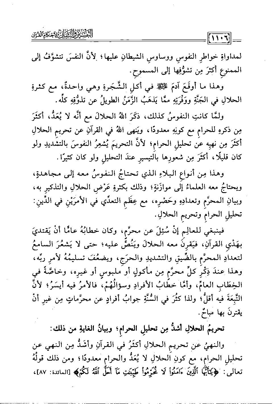 ولمَّا كانتِ النفوسُ كذلك، ذكرَ الله الحلال مع أنه لا يُعَدُّ، أكثَرَ مِن ذكرهِ للحرامِ مع كونه معدودًا، ويَنهى الله في القرآنِ عن تحريمِ الحلالِ أكثَرَ مِن نهيِه عن تحليلِ الحرام؛ لأن التحريمَ يُشعِرُ النفوسَ بالتشديدِ ولو كان قليلًا، أكثَرَ مِن شعورِها بالتيسيرِ عندَ التحليلِ ولو كان كثيرًا.